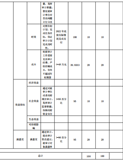 经济责任及财务收支专项审计经费项目绩效自评综述:根据年初设定的绩效目标,经济责任及财务收支专项审计经费项目绩效自评得分为100分。项目全年预算数为40万元,执行数为40万元,完成预算的100%。主要产出和效果:一是保障了审计项目顺利进行;二是控制在预算范围内。