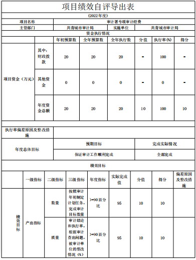 审计署专项审计经费项目绩效自评综述:根据年初设定的绩效目标,审计署专项审计经费项目绩效自评得分为100分。项目全年预算数为20万元,执行数为20万元,完成预算的100%。项目绩效目标完成情况:一是顺利完成了审计项目;二是控制在预算范围内。