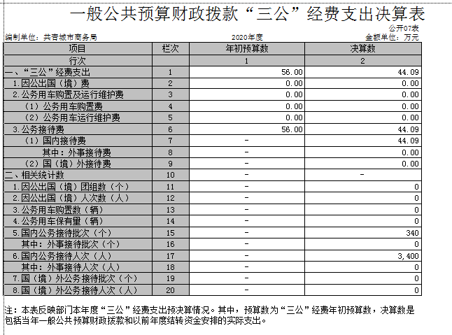 (二)公务接待费支出年初预算数为56万元,决算数为44.0915万元,完成预算的78.73%,决算数较2019年减少9.7737万元,下降18.14%,主要原因是:落实过紧日子要求压减支出。决算数较年初预算数减少的主要原因是:落实过紧日子要求压减支出。全年国内公务接待340批,累计接待3400人次,其中外事接待0批,累计接待0人次,主要为:国内客商以及公务人员。