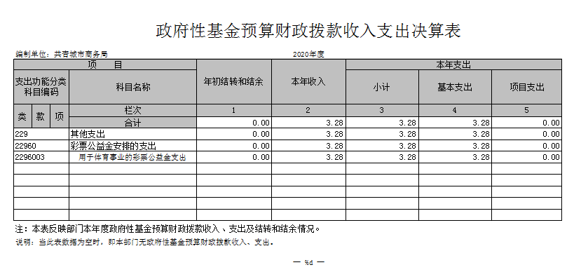 (七)其他支出年初预算数为0万元,决算数为5.6489万元,主要原因是:2020年依据共教体文[2019]77号文件发生的用于体育事业的彩票公益金支出等。