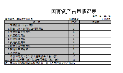 截至2020年12月31日,本部门国有资产占用情况见公开10表《国有资产占用情况表》。副部(省)级及以上领导用车0辆、主要领导干部用车0辆、机要通信用车0 辆、应急保障用车0辆、执法执勤用车0辆、特种专业技术用车0辆、其他用车0辆;单位价值50万元以上通用设备0台(套);单位价值100万元以上专用设备 0台(套)。。