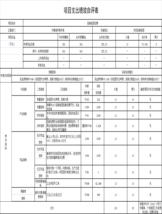 项目绩效自评总体综述:根据年初设定的绩效目标,招商组团经费项目绩效自评得分为98分。项目全年预算数为360万元,执行数为255.29万元,完成预算的70.91%。项目绩效目标完成情况:一各组团外出考察,招商次数超324次,接待来访客商超365次;去年,我市共签约亿元以上项目74个,总投资288.8亿元;二是保障14个组团及专业招商小分队招商经费充足完成招商任务;三是项目预算控制数不超过360万元;四是招商组团意度达到98%及以上。发现的问题及原因:部分招商组团未能够及时完成任务。下一步改进措施:加强绩效管理。