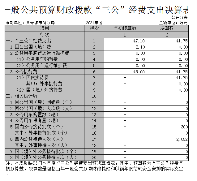 (二)公务接待费支出年初预算数为45万元,决算数为41.75万元,完成预算的92.7%,决算数较2020年减少1万元,下降2%,主要原因是厉行节俭。决算数较年初预算数减少的主要原因是:厉行节俭。全年国内公务接待300批,累计接待2082人次,其中外事接待0批,累计接待0人次,主要为:国内客商以及公务人员。