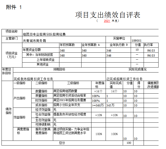 我单位2021年专项,从产出指标、效益指标、满意指标,4项二级指标来看综合得分,组团及专业招商分队招商经费项目得分100;京东云产业扶持资金项目得分100分;外贸扶持资金项目得分100分、招商宣传画册项目得分100分。项目所有开支均按照我单位财务管理制度执行,资金的使用严格把关,整个项目的运行完全按照我单位内部管理制度及财政的有关规定执行。单位内部不定期进行抽查,严格人员作风,不存在违规违法的问题。各个项目资金使用与具体项目实施内容相符,绩效总目标和阶段性目标都已按照计划完成,未逾期。