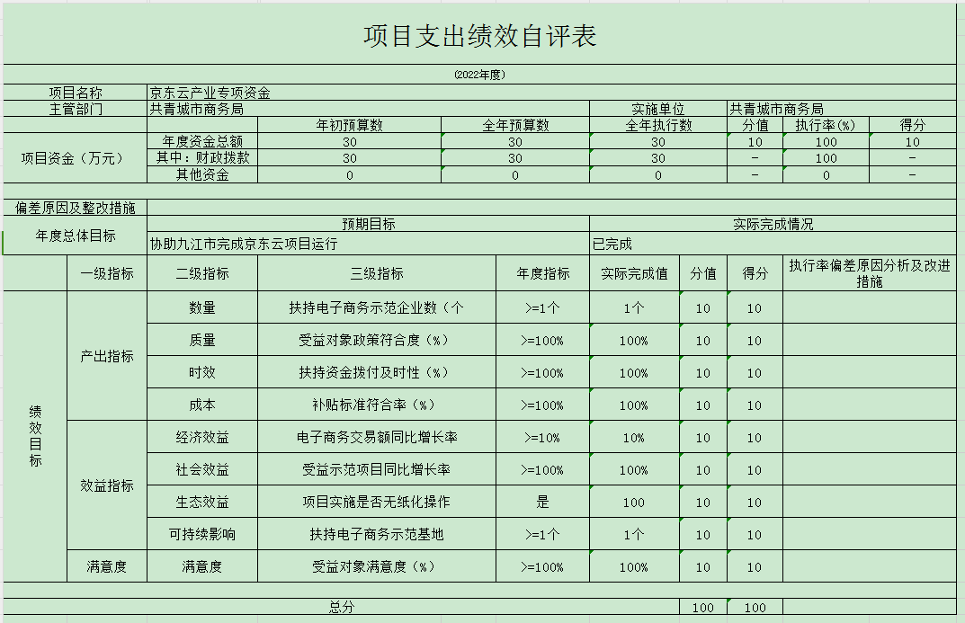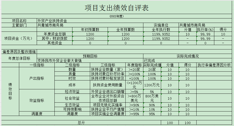 我单位2022年专项,从产出指标、效益指标、满意指标,4项二级指标来看综合得分,京东云产业扶持资金项目得分100分;外贸扶持资金项目得分100分。项目所有开支均按照我单位财务管理制度执行,资金的使用严格把关,整个项目的运行完全按照我单位内部管理制度及财政的有关规定执行。单位内部不定期进行抽查,严格人员作风,不存在违规违法的问题。各个项目资金使用与具体项目实施内容相符,绩效总目标和阶段性目标都已按照计划完成,未逾期。