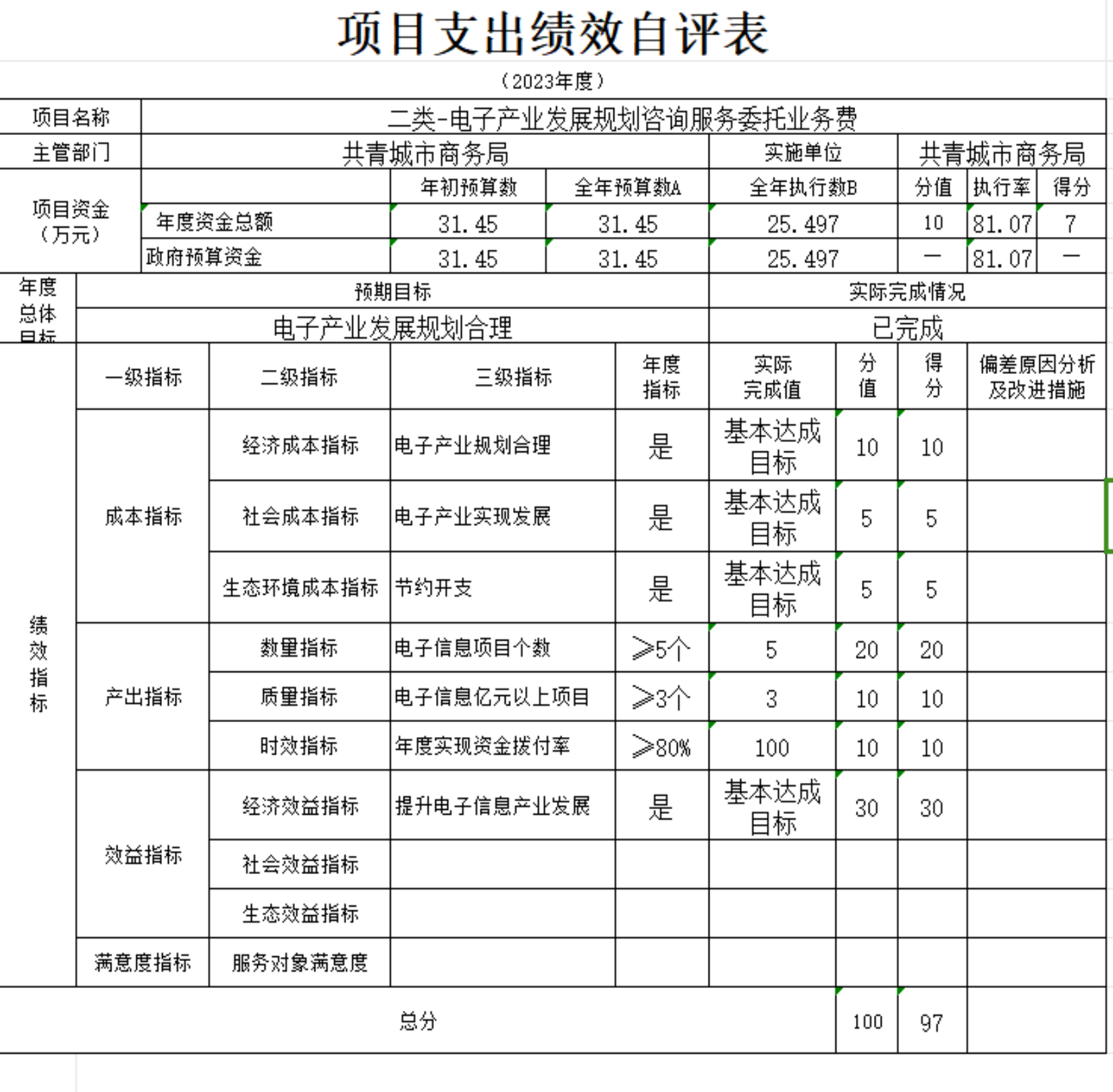 共青城市商务局(本级)“二类-电子产业发展规划咨询服务委托业务费项目支出绩效自评表”如下: