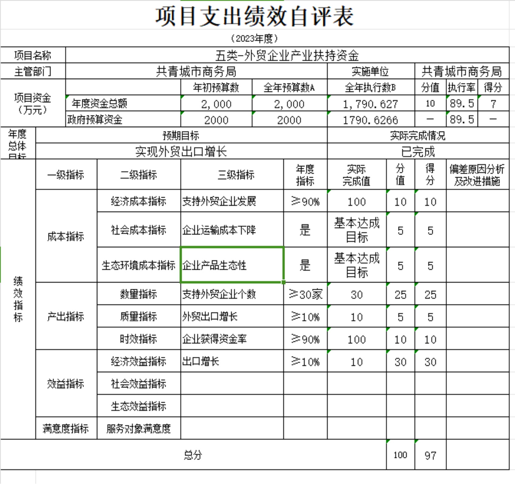 共青城市商务局(本级)“五类-外贸企业产业扶持资金项目支出绩效自评表”如下: