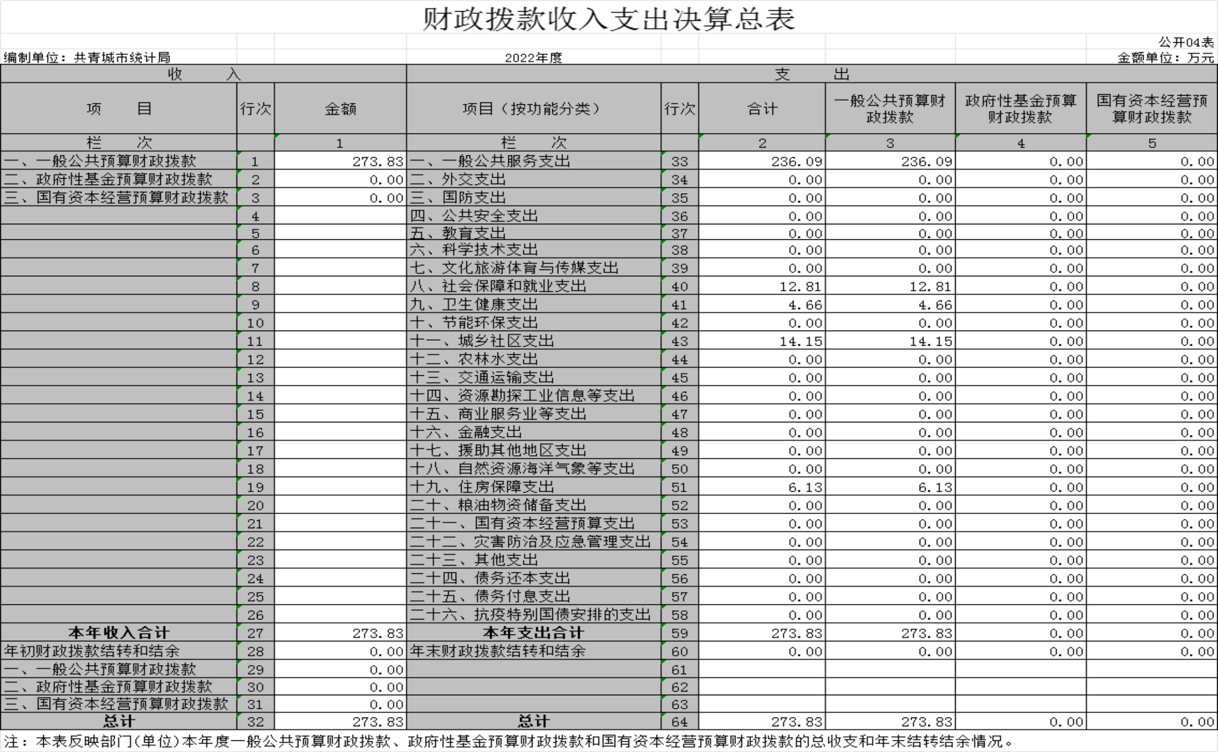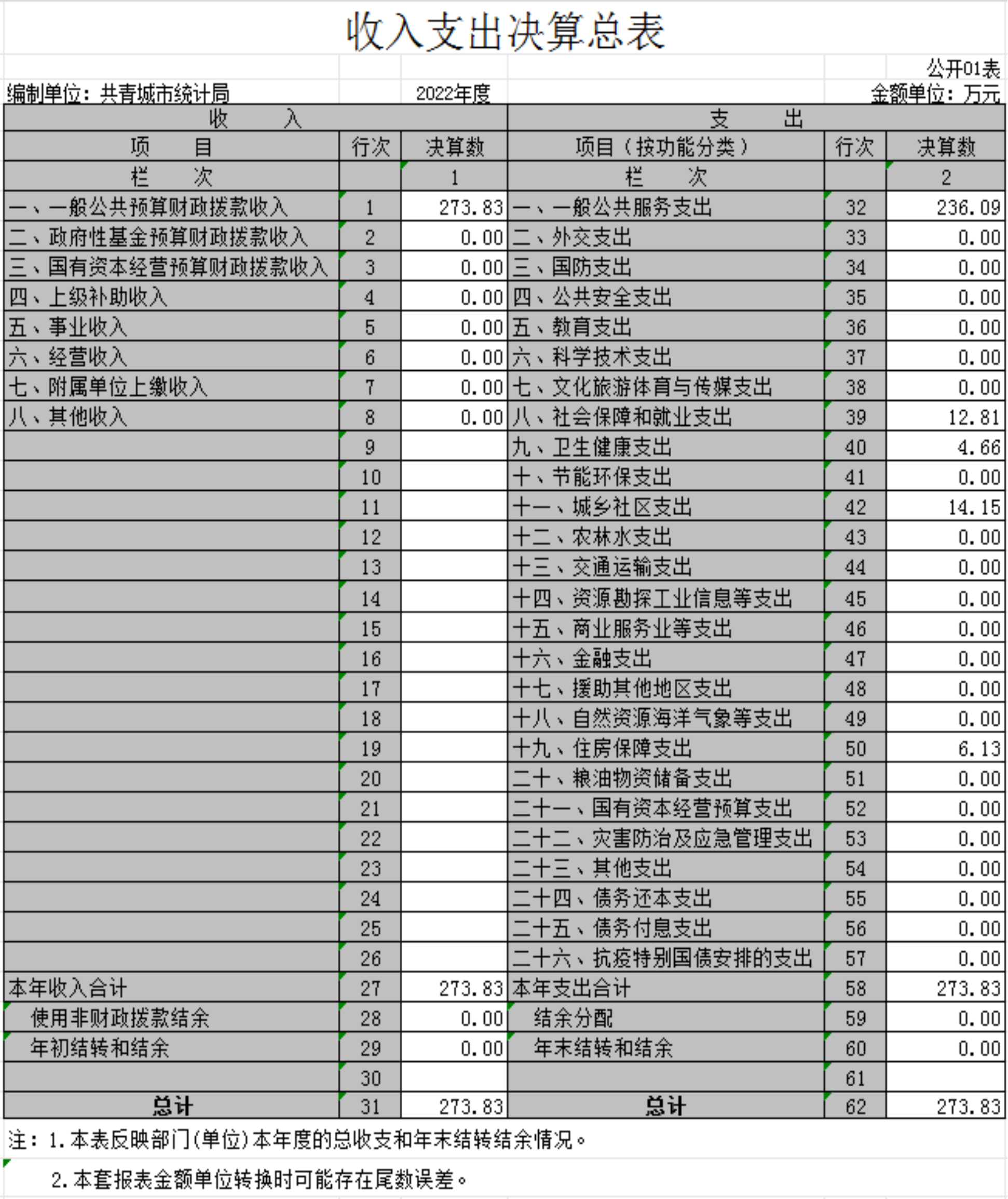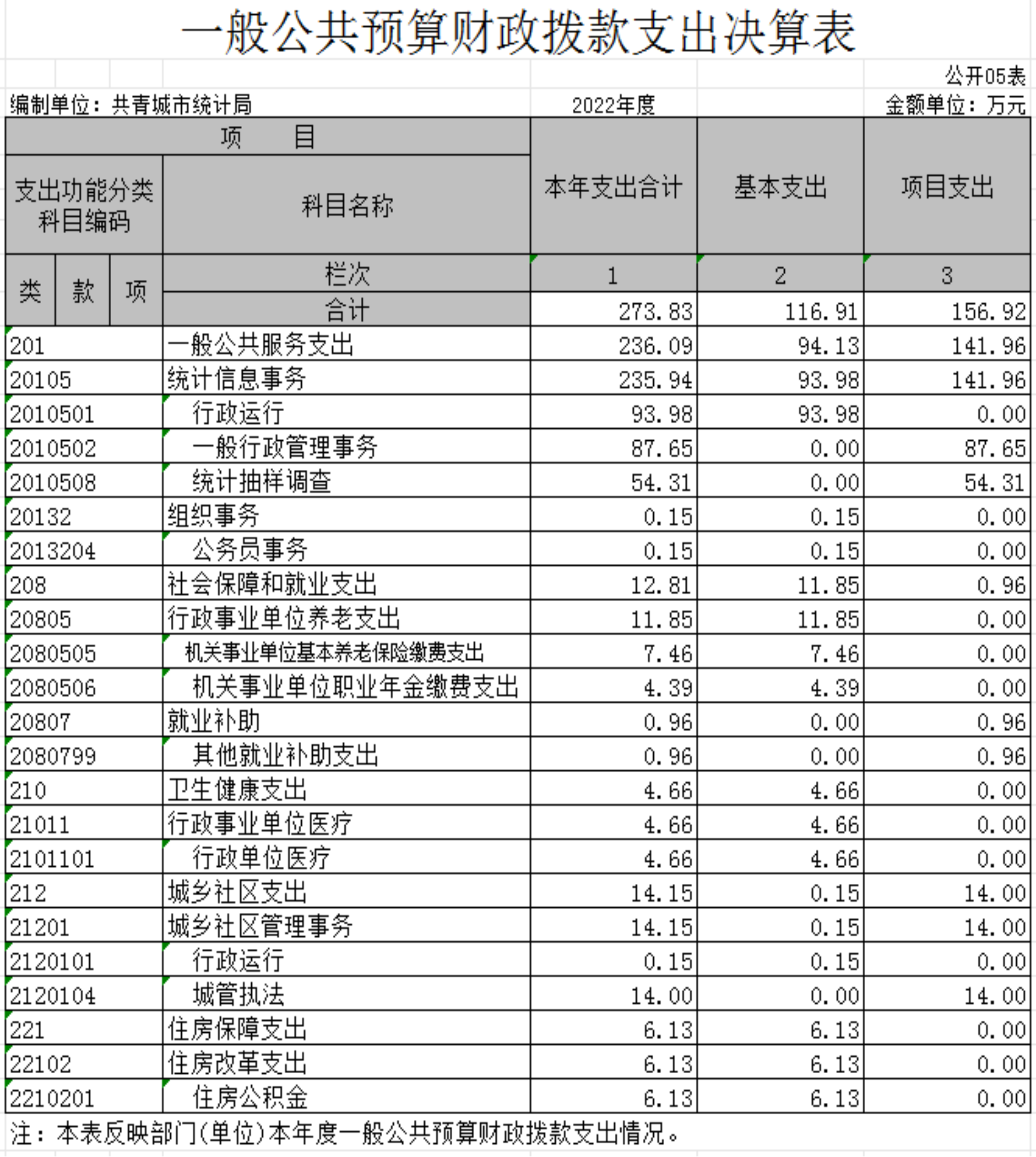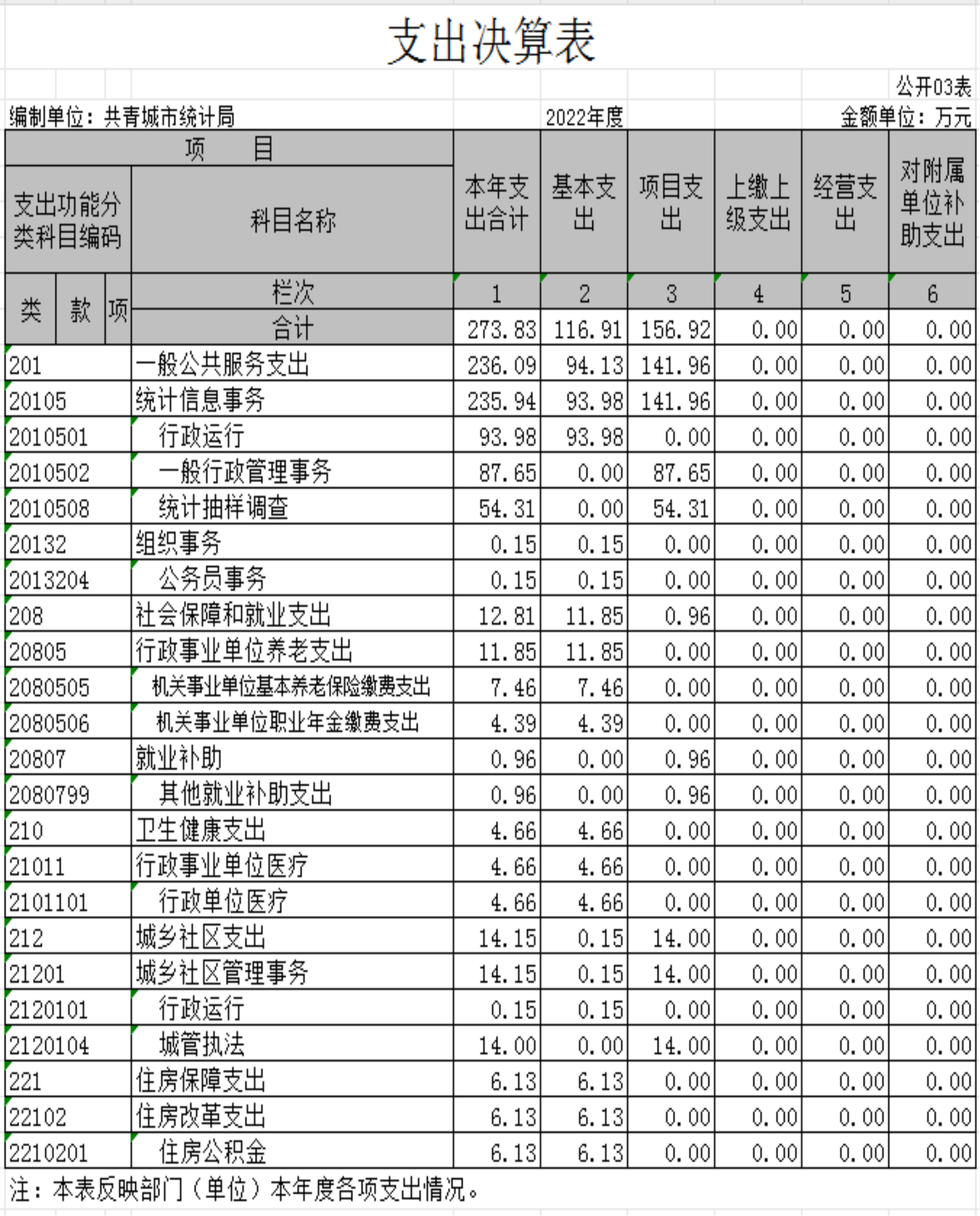 本部门2022年度支出总计 273.83万元,其中本年支出合计 273.83万元,较2021年减少18.95 万元,下降3.2%,主要原因是2022年减少了第七次全国人口普查工作经费;年末结转和结余0万元,较2021年持平,主要原因是:两年无年末结转和结余。