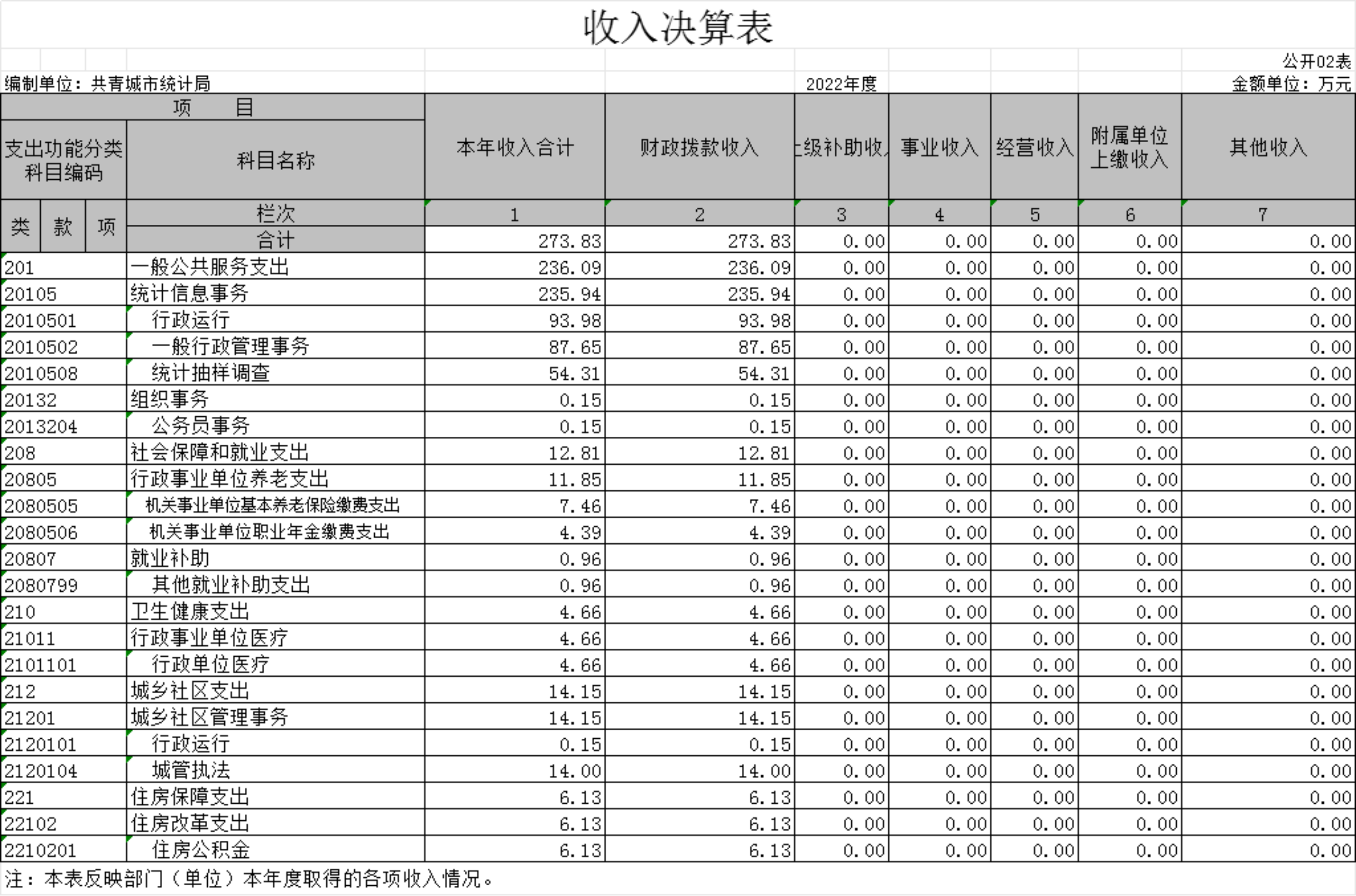 本部门2022年度收入总计 273.83万元,其中年初结转和结余0万元,较2021年减少18.95万元,下降3.2%;本年收入合计273.83万元,较2021年减少18.95万元,下降3.2 %,主要原因是:1、我局严格落实预算法和完善预算管理制度,牢固树立过紧日子,厉行勤俭节约;2、项目支出减少,2021年是第七次全国人口普查年,预算经费64万元,22年无该项目费用支出。
