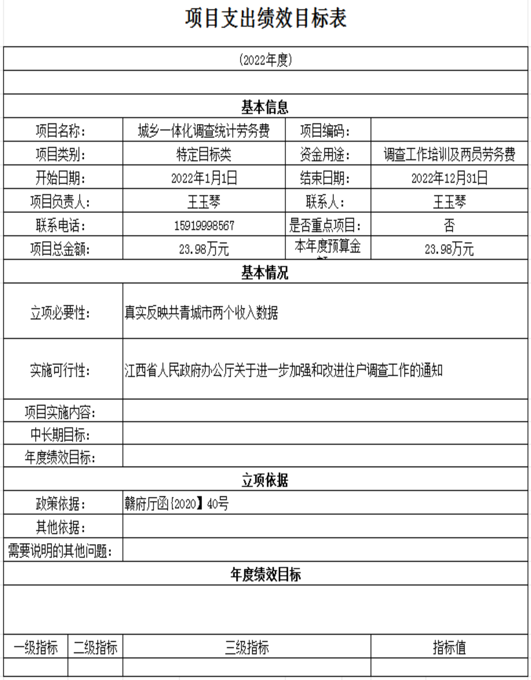 项目绩效自评综述:根据年初设定的绩效目标,城乡一体化调查统计劳务费绩效自评得分100分。项目全年预算数为23.98万元,执行数为23.98万元,完成预算的100%。主要产出和效果:1、及时掌握社情民情、精确研判形势、科学制定政策依据。2、通过调查,不断提高数据质量,更好地为宏观决策和经济社会发展服务。