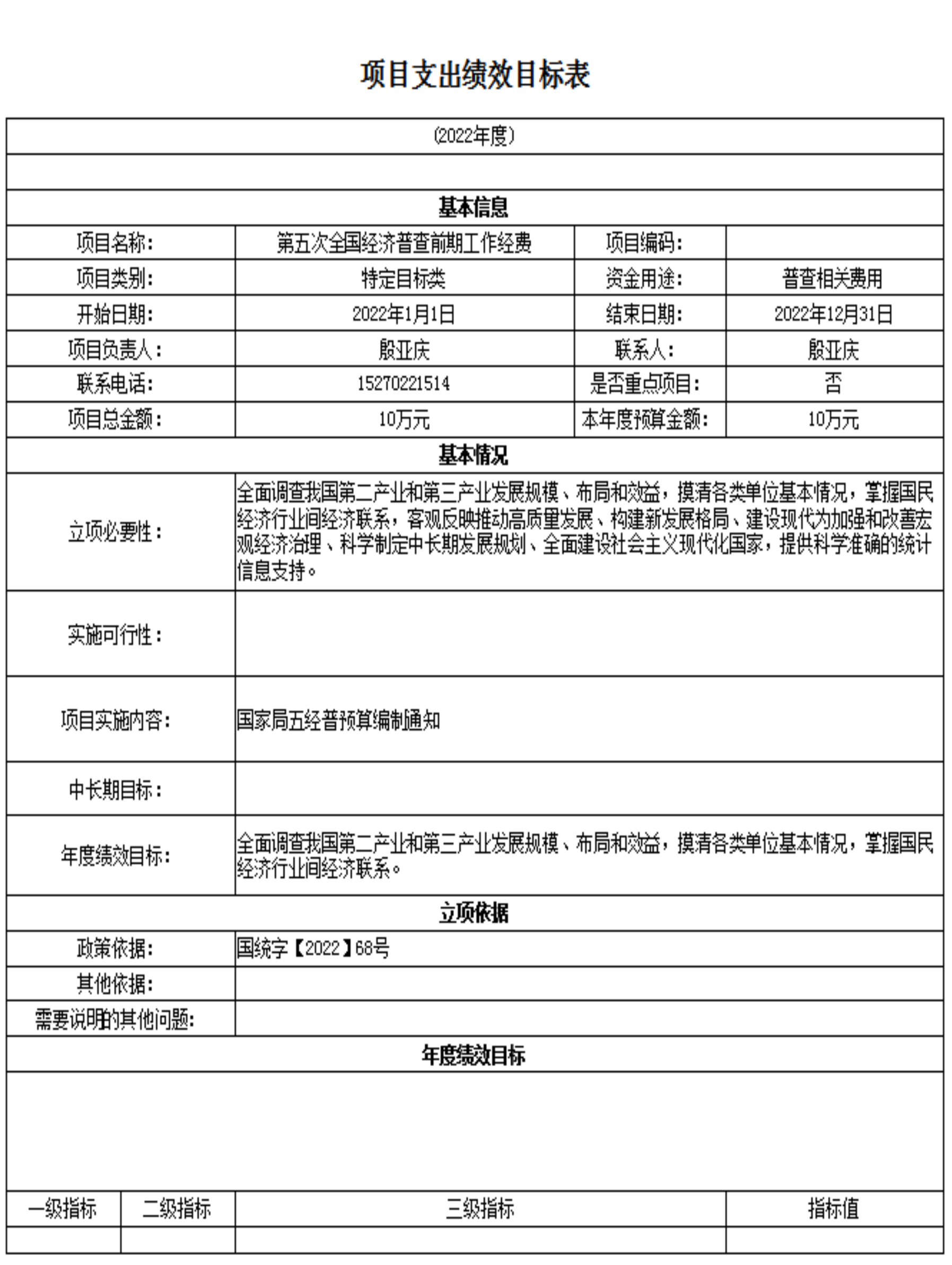 根据年初设定的绩效目标,第五次全国经济前期普查绩效自评得分100分。项目全年预算数为10万元,执行数为10万元,完成预算的100%。主要产出和效果:全面调查我国第二产业和第三产业的发展规模、布局和效益,掌握国民经济行业间经济联系,客观反映创新驱动发展、绿色低碳发展和数字经济发展等新进展,为加强和改善宏观经济治理,科学制定中长期发展规划,推动经济高质量发展,全面建设社会主义现代化国家提供科学准确的统计信息支持。
