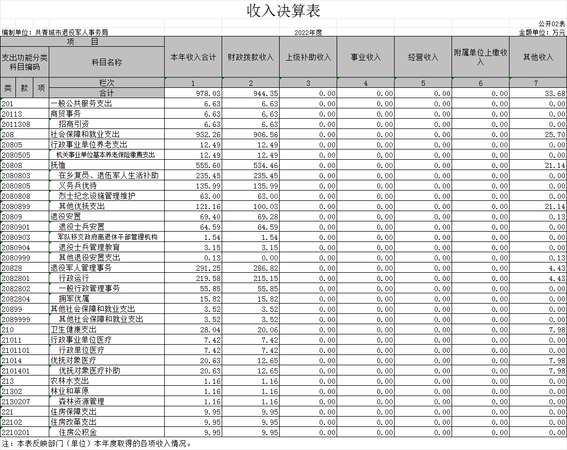 本部门2022年度收入总计978.03万元,其中年初结转和结余0万元,较2021年增加9.42万元,增长0.97%;本年收入合计978.03万元,较2021年增加15.72万元,增长1.63%,主要原因是:财政加大了对退役军人事务的投入,如提高了义务兵家庭优待金发放标准和优抚对象生活补助发放标准等。