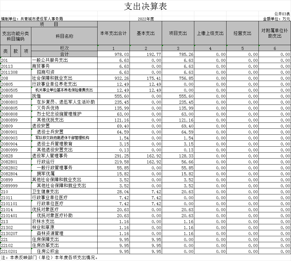 本部门2022年度支出总计978.03万元,其中本年支出合计978.03万元,较2021年增加9.42万元,增长0.96%,主要原因是:财政加大了对退役军人事务的投入,相应支出增加等;年末结转和结余0万元,较2021年增加(减少)0万元,增长(下降)0%,主要原因是:2022年与2021年都无年初结转结余金额。