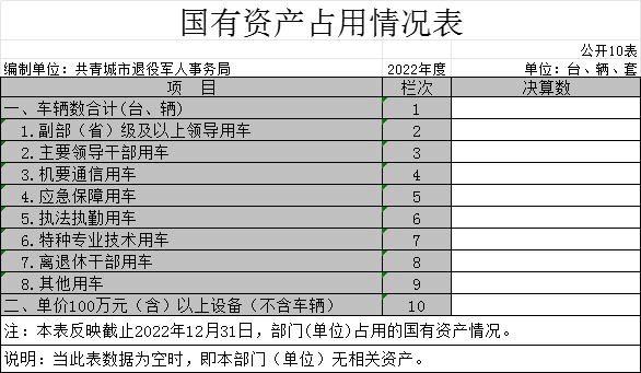 截止2022年12月31日,本部门国有资产占用情况见公开10表《国有资产占用情况表》。其中车辆中的其他用车主要是:无其他用车。