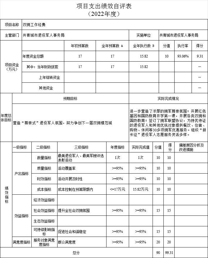 (四)根据相关文件规定及财政专项资金绩效评价指标体系和评价标准,结合部门实际情况,确定评价实际得分为95.52分,评价等级为“优”。