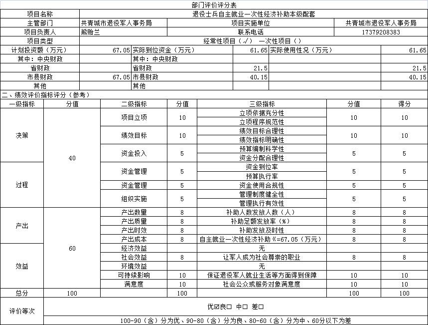 组织对“退役士兵自主就业一次性经济补助本级配套”项目开展了部门评价,涉及一般公共预算支出67.05万元,政府性基金预算支出0万元,国有资本预算支出0万元。从评价情况来看,已基本完成年初设定目标,自主就业退役士兵权益得到保障,有效改善了自主就业退役士兵家庭生活状况,提高了自主就业退役士兵生活水平,巩固军政军民团结、促进经济发展、维护社会稳定。