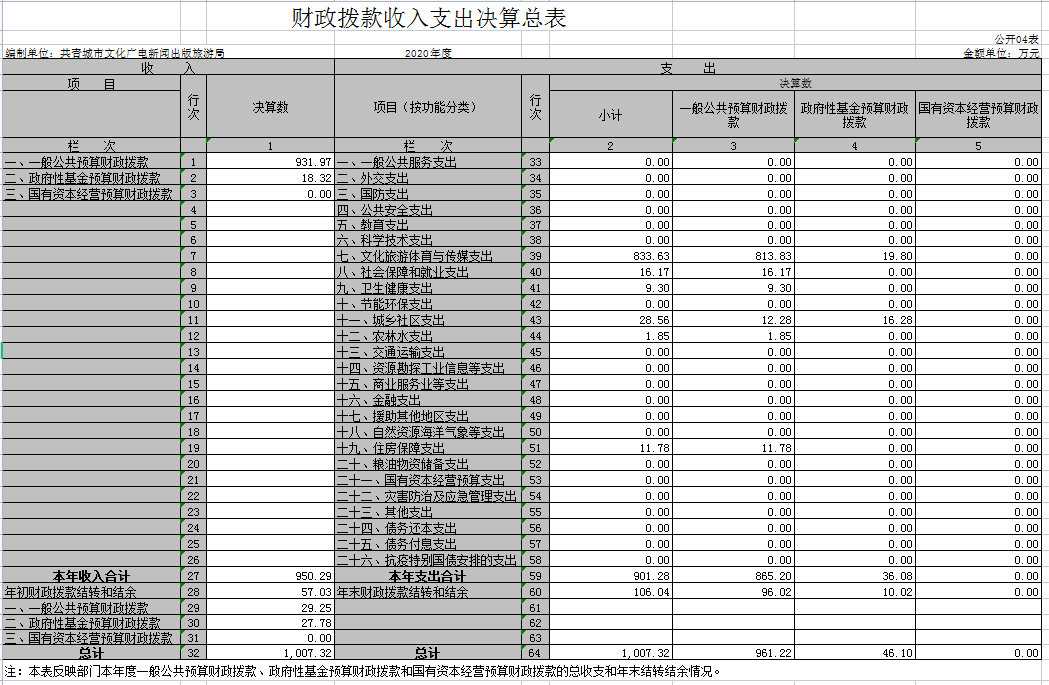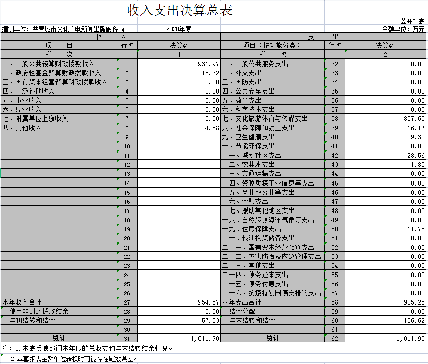 本部门2020年度收入总计1011.90万元,其中年初结转和结余57.03万元,较2019年