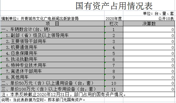 截至2020年12月31日,本部门国有资产占用情况见公开10表《国有资产占用情况表》,无数据,共车辆0辆。