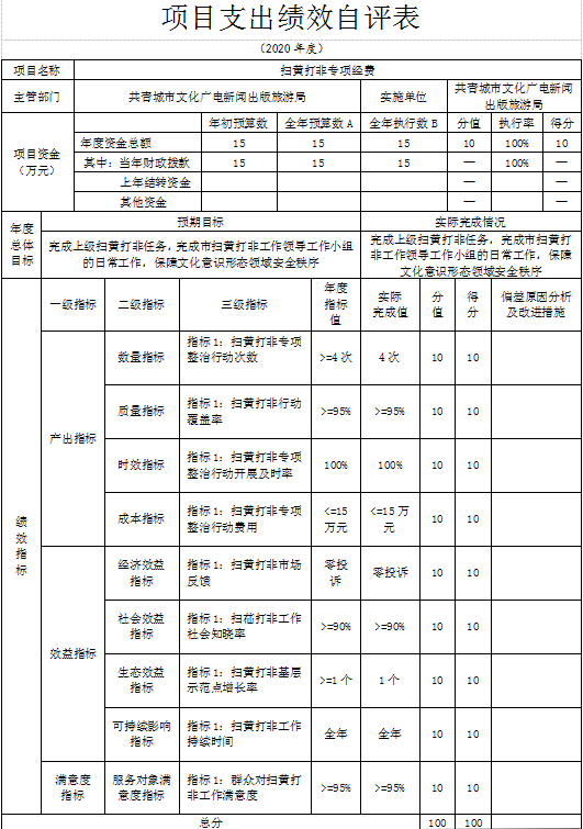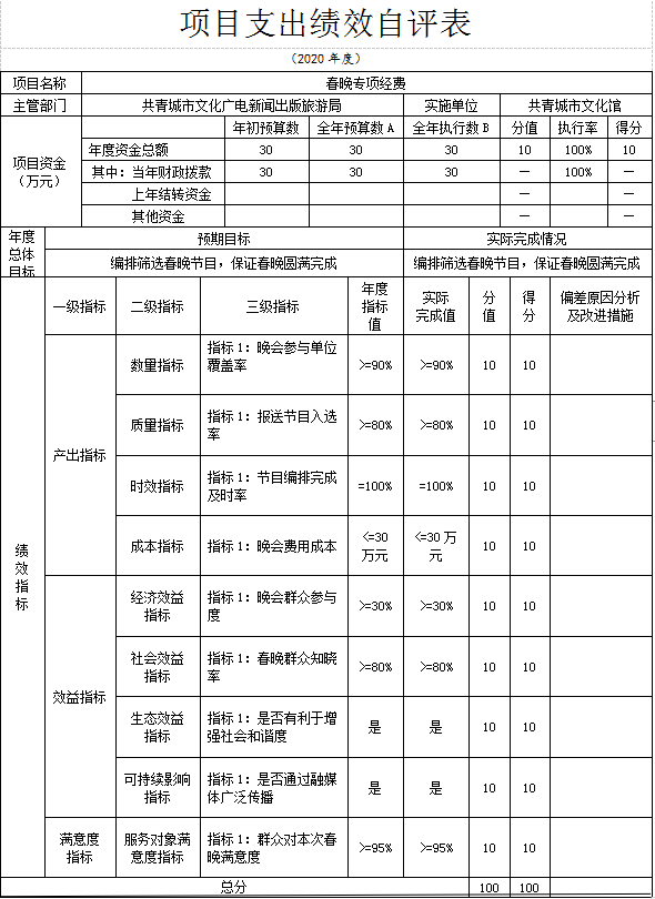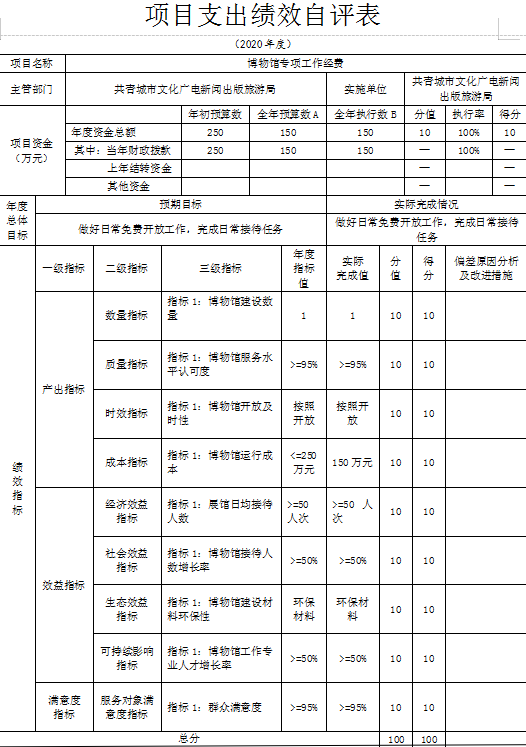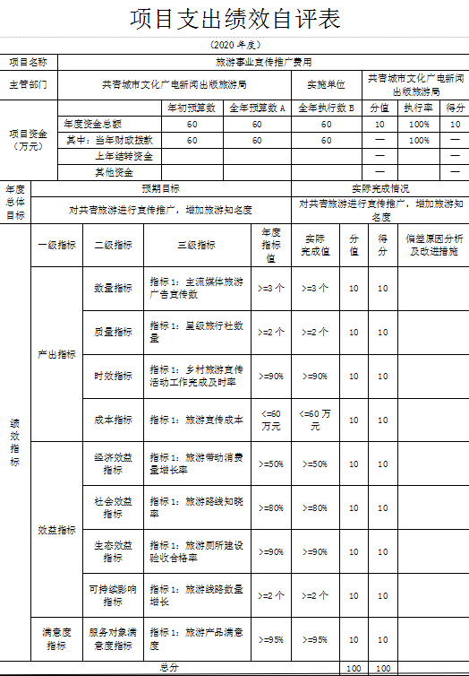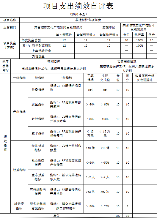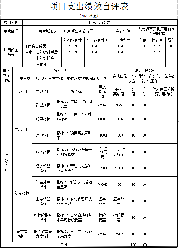 项目绩效自评总体综述:根据年初设定的绩效目标,项目绩效自评得分为98分。项目全年预算数为402.70万元,执行数为 402.70万元,完成预算的100%。项目绩效目标完成情况:一是已完成6个乡镇(街道)综合文化站、48个村(社区)综合文化服务中心、61个农家书屋、40个行政村广播村村响系统的公共文化基础设施整合;二是全力推进两馆项目建设并实现对外免费开放,开展文化惠民活动;三是强化文化市场监督,培育健康文化市场秩序;四是推进旅游基础设施建设,继续推进富华山景区创建国家5A级景区工作。发现的问题及原因:一是项目绩效目标设立不明确,不细化,缺乏项目论证的充分可行性报告;二是项目管理制度不完善,项目管理不到位;三是有些项目实施进度缓慢,没有充分发挥财政资金的使用效益。下一步改进措施:结合当前工作目标编制科学合理的预算。对项目立项未申报绩效目标的问题,将建立制定科学合理的绩效目标。对债权债务进行清理。加强预算编制管理,科学合理规划项目设施制度,严格按预算批复的资金用途使用资金。今后将在年末上报决算时,完善与财政部门的对账工作,核算部门支出与财政支出的差异情况,准确反映预算编制情况。