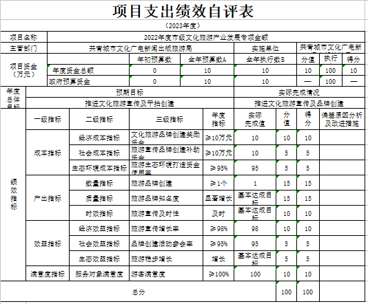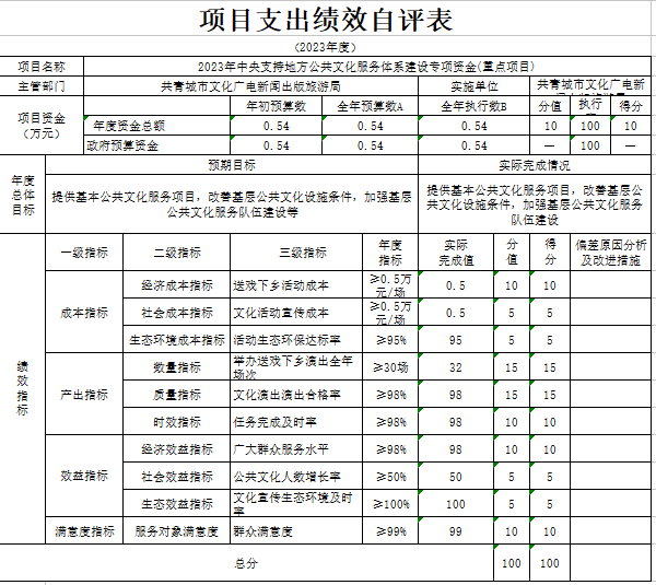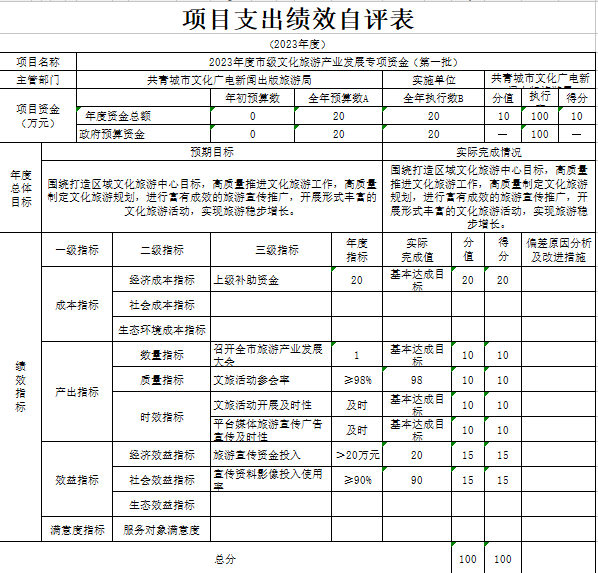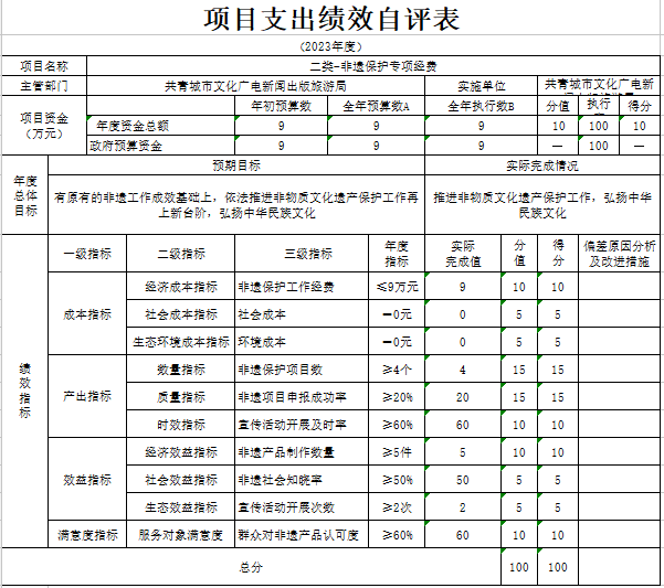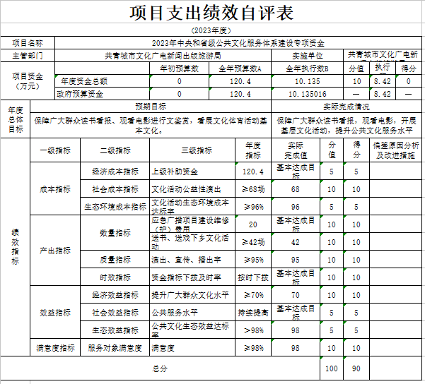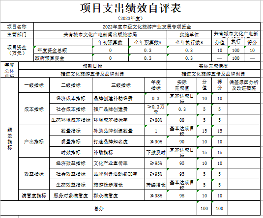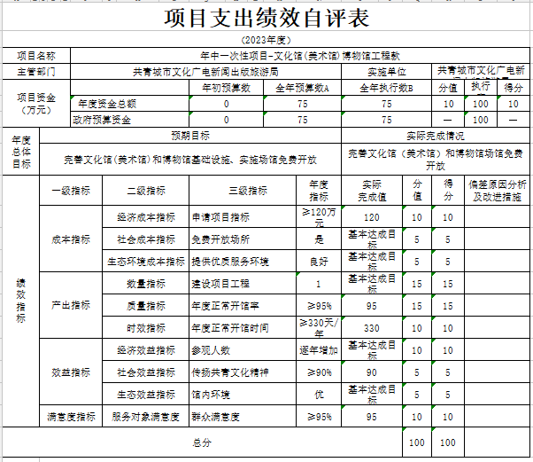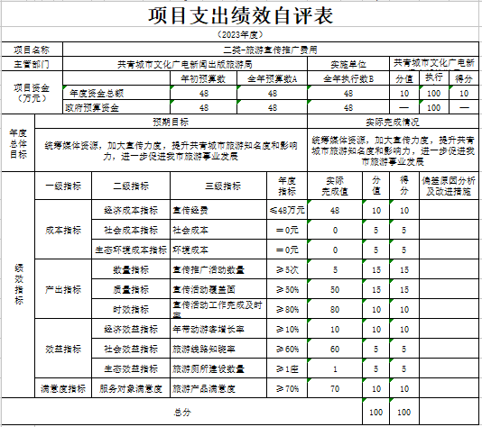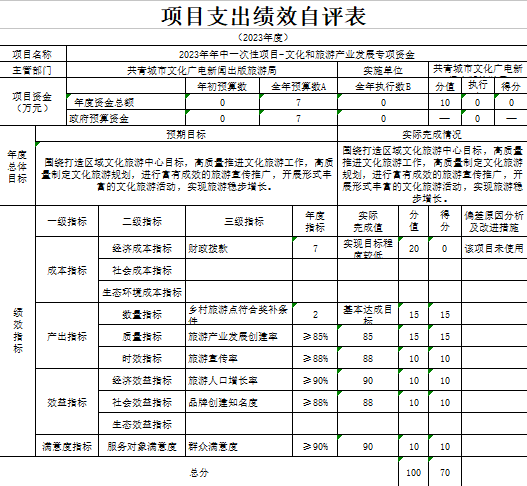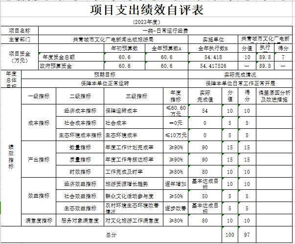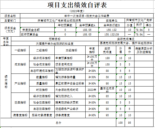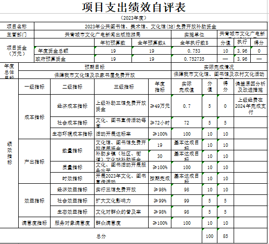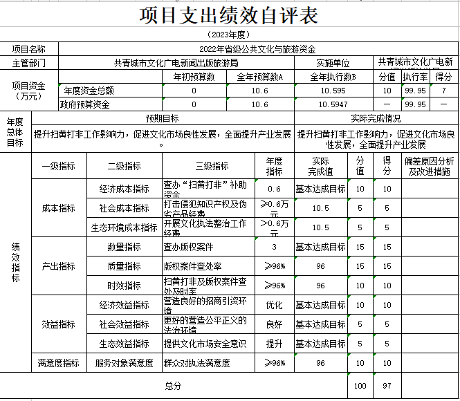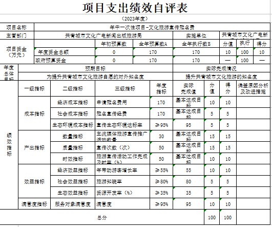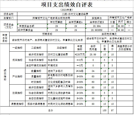 部门预算绩效管理开展情况。为进一步加强对我局预算绩效管理工作的组织领导,全面推进我局预算绩效管理工作的深入开展,成立了文广新旅局预算绩效管理工作领导小组,制定了我局绩效考核管理办法,按照管理办法,对2023年所有本级项目开展绩效自评工作,跟踪查找薄弱环节,及时堵塞管理“漏洞”,纠正执行偏差,并按照文件要求将上述绩效信息向社会公开。