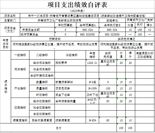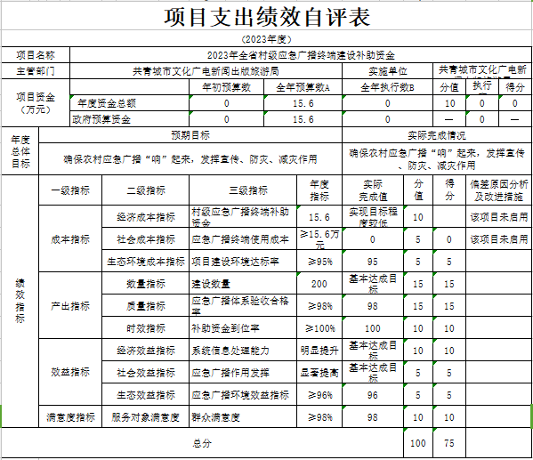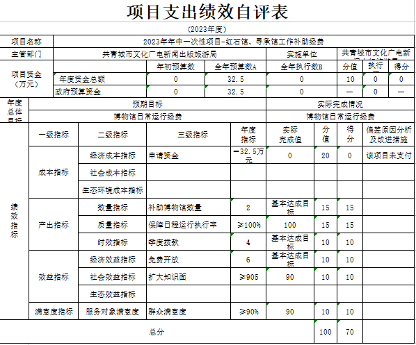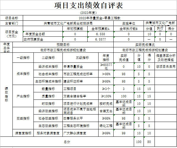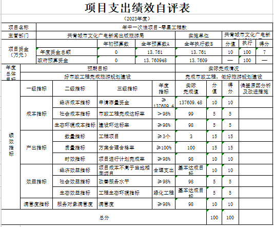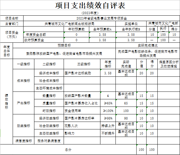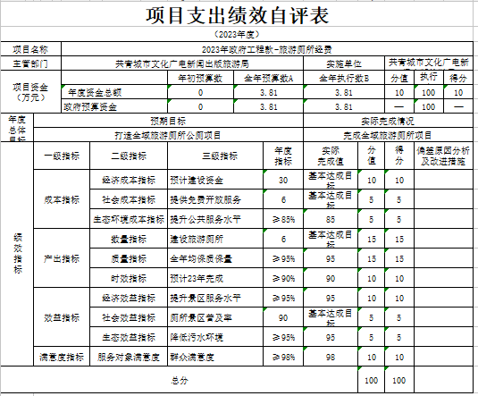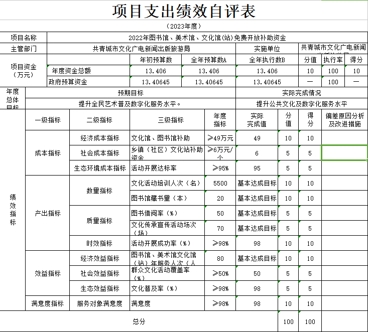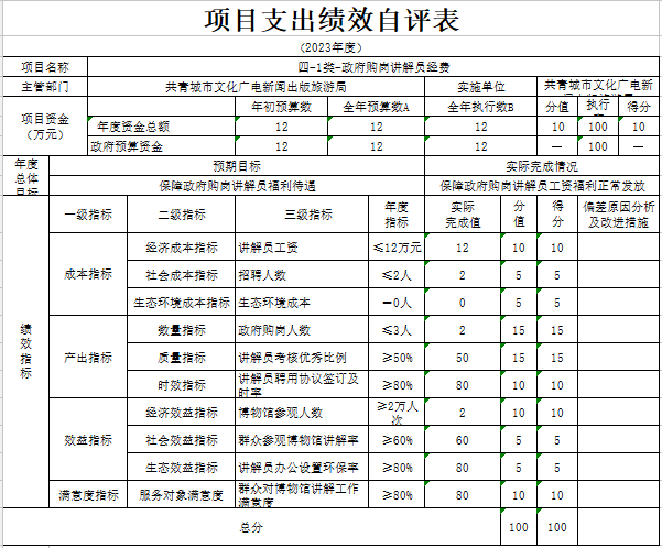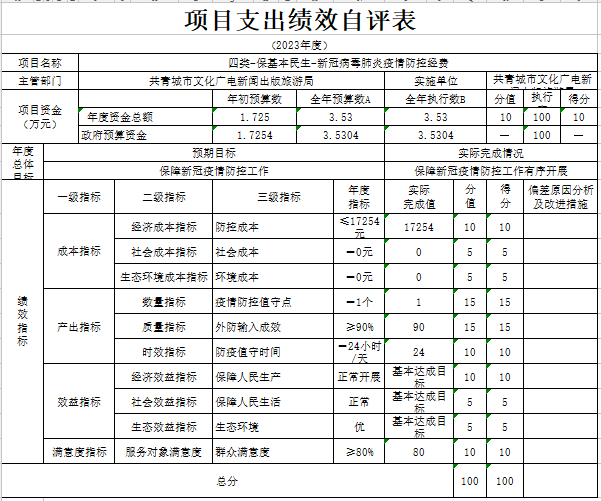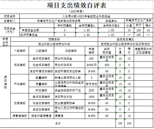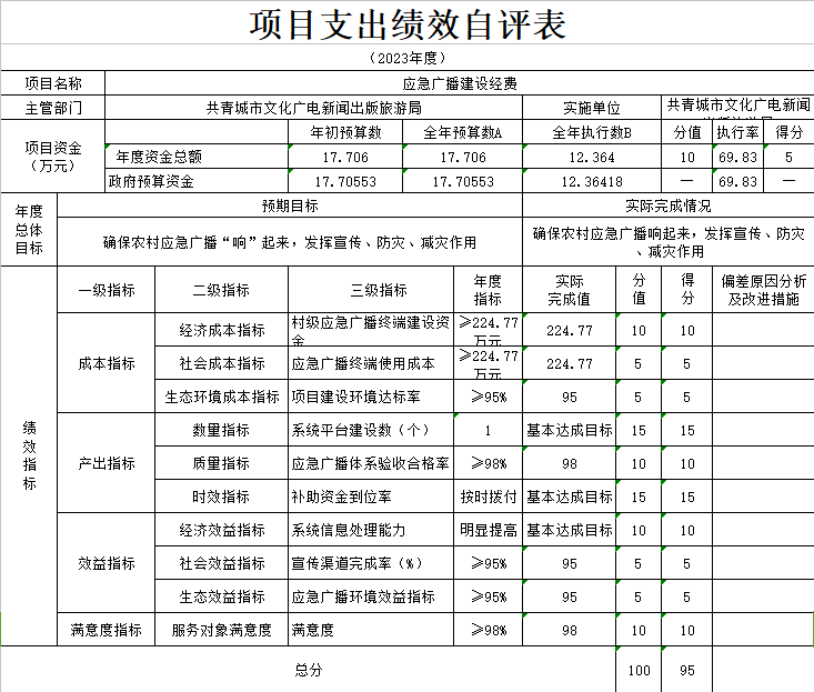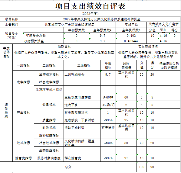 部门预算绩效管理开展情况。为进一步加强对我局预算绩效管理工作的组织领导,全面推进我局预算绩效管理工作的深入开展,成立了文广新旅局预算绩效管理工作领导小组,制定了我局绩效考核管理办法,按照管理办法,对2023年所有本级项目开展绩效自评工作,跟踪查找薄弱环节,及时堵塞管理“漏洞”,纠正执行偏差,并按照文件要求将上述绩效信息向社会公开。