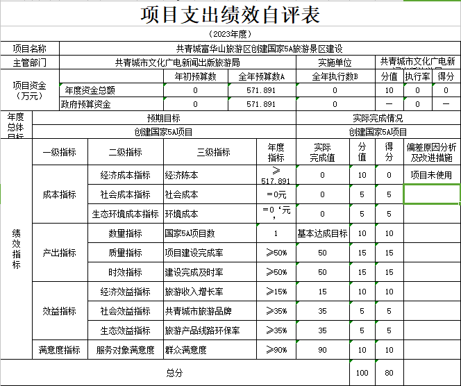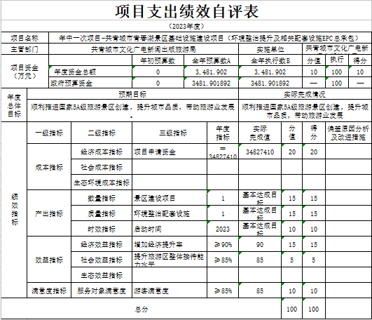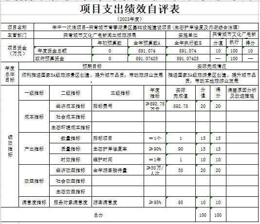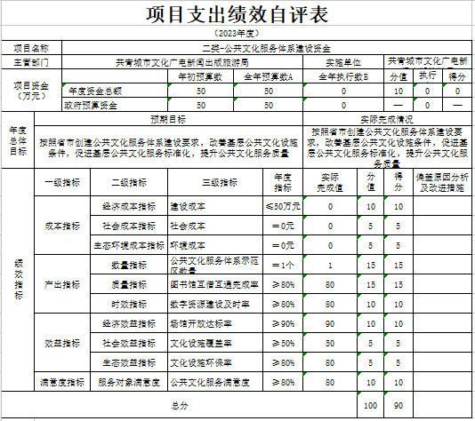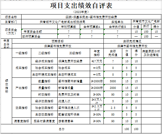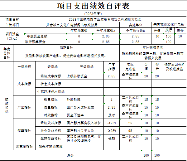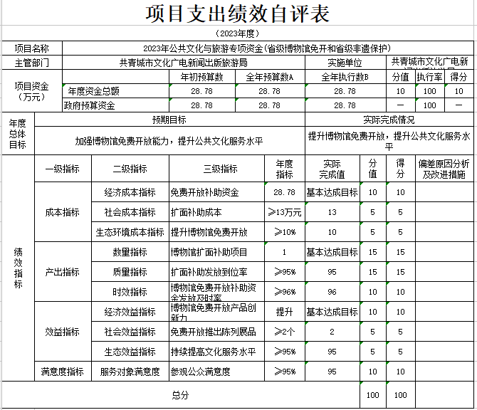 根据绩效评价的要求,我们成立了自评工作领导小组,对照自评方案进行研究和布署,党组成员及机关各股室全程参与,按照自评方案的要求,对照各实施项目的内容逐条逐项自评,及时报送2023年项目资金绩效监控材料、自评材料,内容按项目支出做了说明,项目指行严格按年初制订的目标实施;政府采购工作专人负责,季度、年度按系统要求及时录入数据报送。