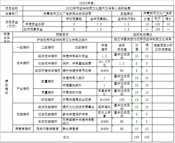部门整体支出绩效实现情况。由市委宣传部牵头,共同承办了2023年共青城市正月十五闹元宵系列活动,涵盖舞龙舞狮、元宵晚会、非遗展示、烟花秀展示等内容,丰富群众精神文化生活,赢得了广大群众的高度评价。积极开展广场舞展演,组织参加九江市“大地欢歌”乡村文艺明星选拔赛活动,7个节目入围九江市决赛,威风锣鼓队《展共青风采》、西河戏《陶母戒子》2个节目获九江市一等奖。开展送戏下乡30场完成全年任务125%,送电影下乡498场,全民阅读活动持续开展,举办了2023年共青城市第八届“中华诵·中国梦”诗词知识大赛、“建设版权强国 讲好版权故事”宣传活动,积极营造“多读书、读好书、善读书”的良好风尚。完成创建国家公共文化服务体系示范区复核工作各项任务。常态化开展非遗进校园工作,推荐九江市级非遗——共青羽绒画参加深圳文博会,推荐九江市级非遗——共青板鸭参加江西省非遗购物节。完成了共青城市第三批县级文物保护单位、第四批非遗项目申报等工作。博物馆与南昌大学共青学院签订“馆校共建”协议,正式挂牌“思想政治理论课与红色文化实践教学基地”。