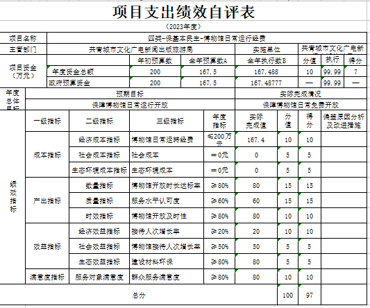 组织对“二类-扫黄打非工作经费项目”、“四类-保基本民生-博物馆日常运行经费”两个项目开展了部门评价,涉及一般公共预算支出211万元,政府性基金预算支出0万元,国有资本预算支出0万元。从评价情况看,“二类-扫黄打非工作经费项目”评价得分100,“四类-保基本民生-博物馆日常运行经费”评价得分97。