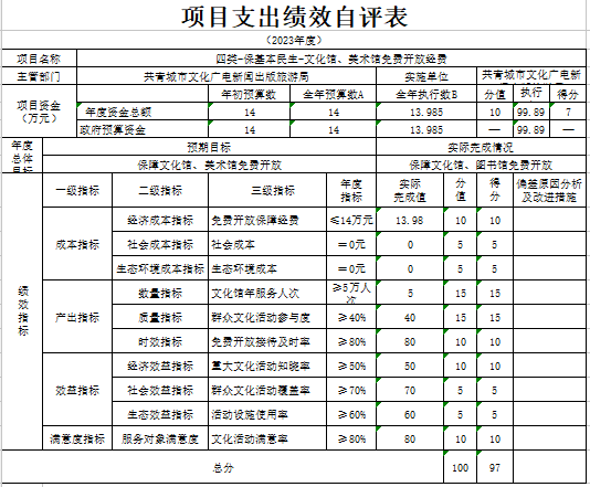 2023年,我单位积极履职,强化管理,较好地完成了年度工作目标。通过加强预算收支管理,不断建立健全内部管理制度。根据部门整体支出绩效评价指标体系,“二类-扫黄打非工作经费”2023年度评价得分为100,“四类-保基本民生-博物馆日常运行经费”2023年度评价得分为97。