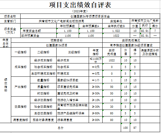 (五)城乡社区支出(类)年初预算数1100.00万元,决算数1022.00万元,完成年初预算的92.91%。预决算差异主要原因:创建国家5A专项债项目资本金。
