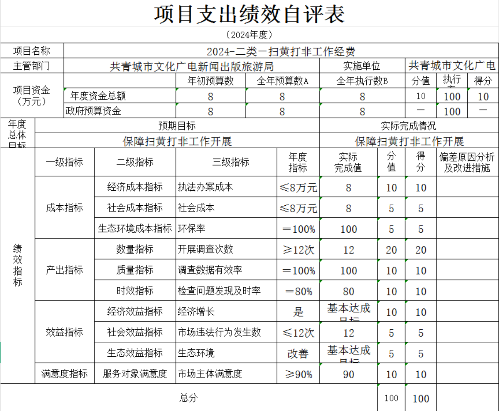 2024年,我单位积极履职,强化管理,较好地完成了年度工作目标。通过加强预算收支管理,不断建立健全内部管理制度。根据部门整体支出绩效评价指标体系,“二类-扫黄打非工作经费”2024年度评价得分为100,“一类-日常运行经费”2024年度评价得分为97。