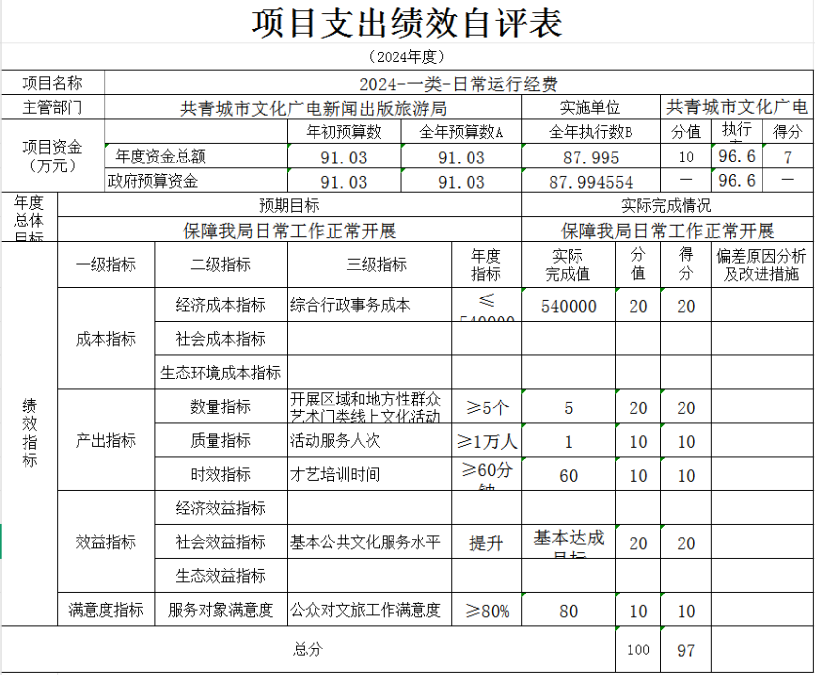 共青城市文化广电旅游局(本级)“日常运行经费”“扫黄打非工作经费” 等44个项目支出绩效自评结果见附件。
