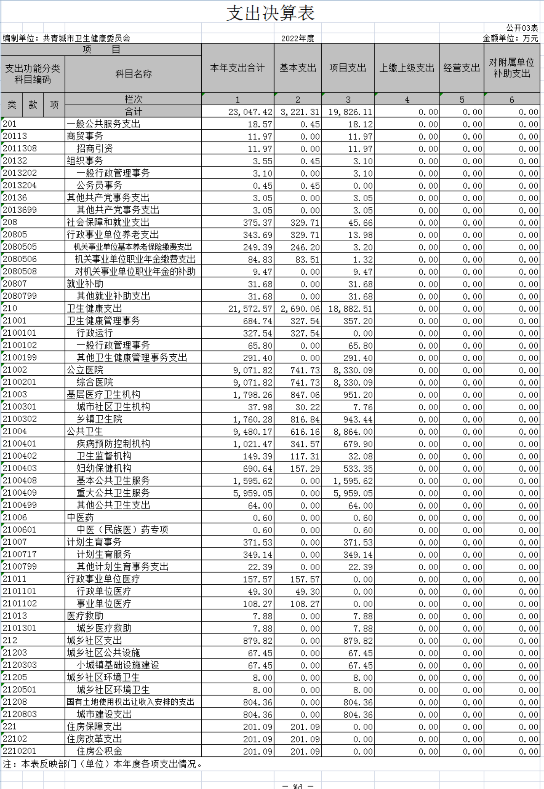 本部门2022年度支出总计23047.42万元,其中本年支出合计23047.42万元,较2021年增加3681.96万元,增长19.01%,主要原因是:2022年我市突发新冠疫情,造成新冠疫情防控支出较上年大幅度增长;年末结转和结余0万元,较2021年增加0万元,增长0%,主要原因是:本年度没有年末结转和结余资金。