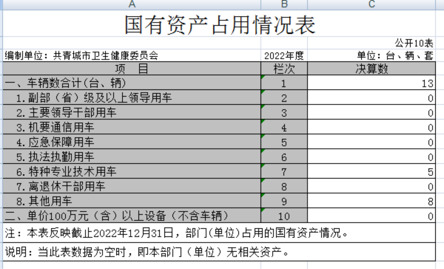 截止2022年12月31日,本部门国有资产占用情况见公开10表《国有资产占用情况表》。其中车辆13辆,车辆中的其他用车13辆,车辆中的其他用车主要是120救护车7辆、冷链运输车2辆、业务用车2辆、卫生监督用车1辆、妇幼保健用车1辆;单价50万元以上通用设备0台;单价100万元