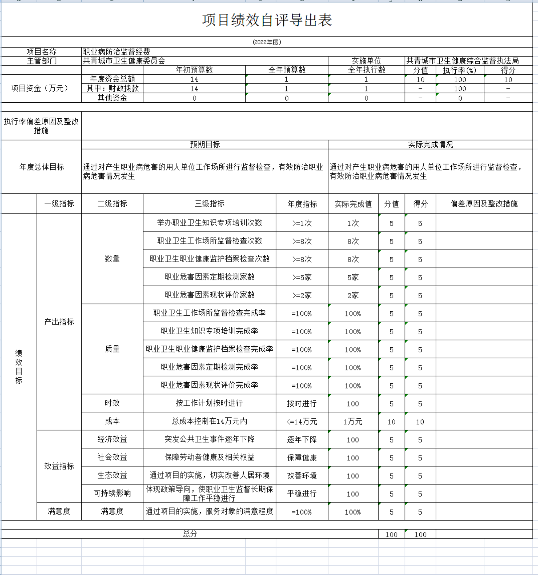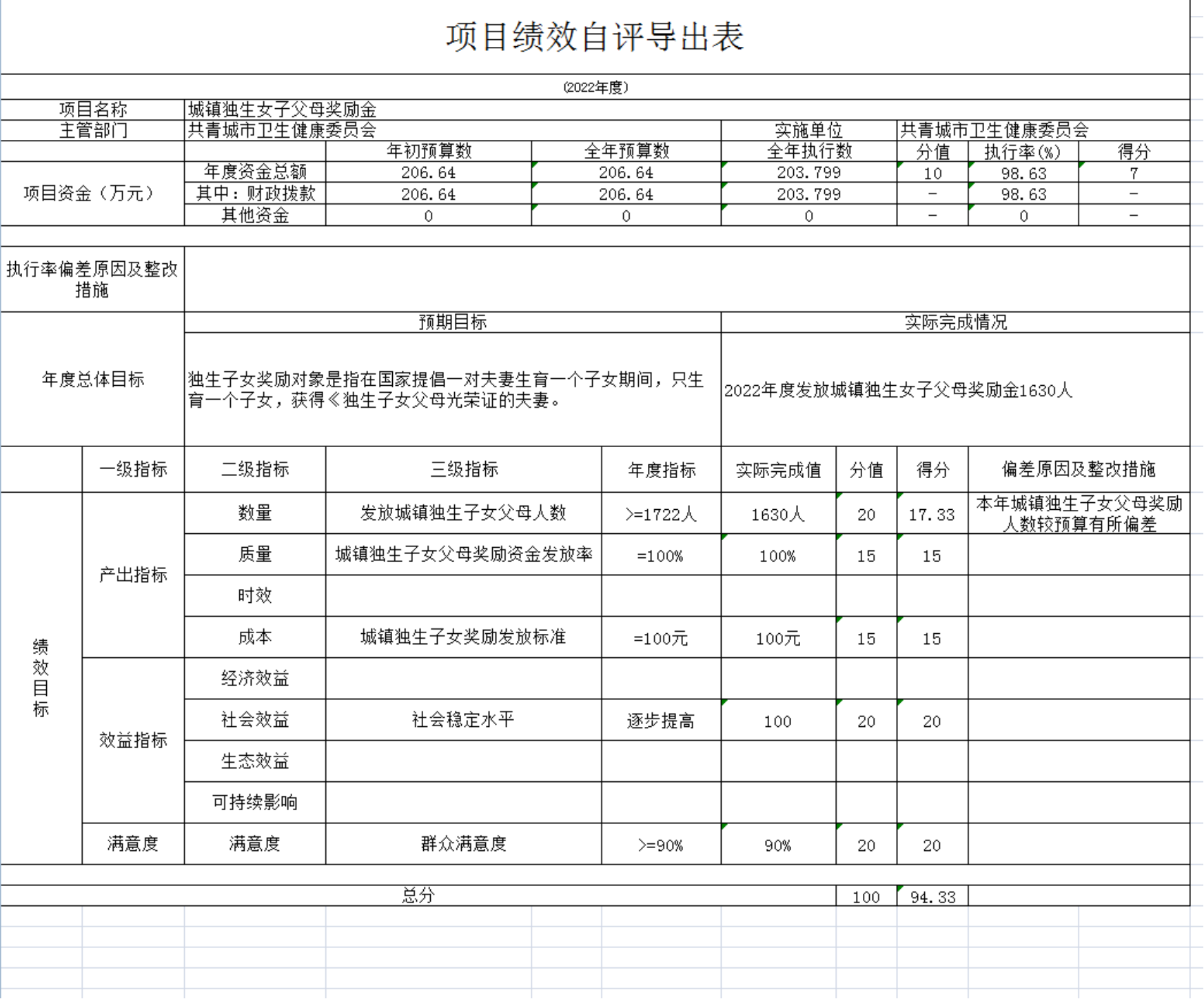 2022年本部门按照公共卫生、基层卫生、城市医疗、妇幼卫生、综合监督等五个方面,细分为138个二级项目,一级指标按照产出指标、效益指标、满意度,二级指标按照数量、质量、时效、成本、经济效益、社会效益、生态效益、可持续影响、满意度,进行设置项目绩效目标。