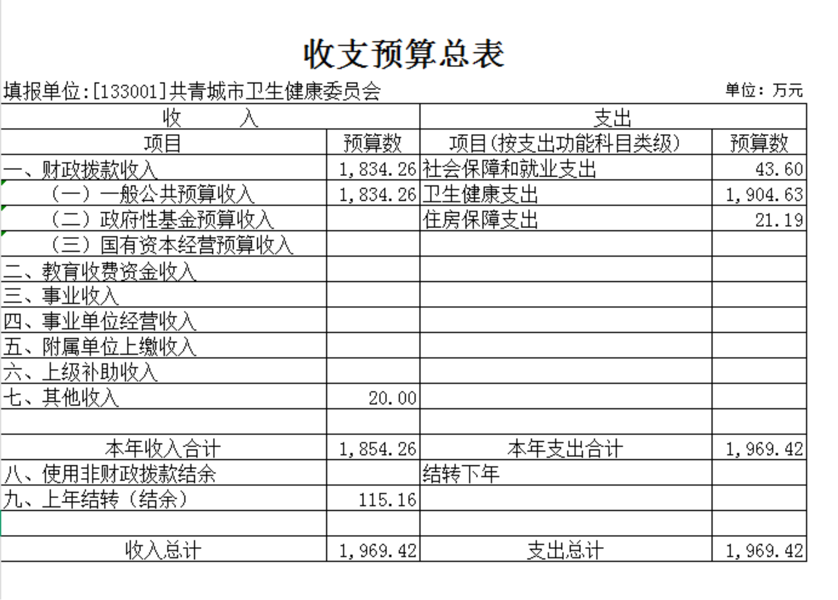 2025年共青城市卫生健康委员会本级收入预算总额为1969.42万元,较上年预算安排减少485.09万元,减少的原因是本年没有新冠疫情防控经费预算,新冠疫情防控经费预算较上年减少489.04万元。其中:财政拨款收入1834.26万元,较上年预算安排减少446.54万,减少的原因是本年没有新冠疫情防控经费预算,新冠疫情防控经费预算较上年减少489.04万元;教育收费资金收入0万元,较上年预算安排增加0万元,无变化的原因是没有教育收费资金收入;事业收入0万元,较上年预算安排增加0万元,无变化的原因是没有事业收入;事业单位经营收入0万元,较上年预算安排增加0万元,无变化的原因是没有事业单位经营收入;附属单位上缴收入0万元,较上年预算安排增加0万元,无变化的原因是没有附属单位上缴收入;上级补助收入0万元,较上年预算安排增加0万,无变化的原因是没有上级补助收入;其他收入20万元,较上年预算安排增加12万元,增加的原因是单位大楼电费分摊非税资金收入;使用非财政拨款结余0万元,较上年预算安排增加0万元,无变化的原因是没有使用非财政拨款结余;上年结转结余115.16万元,较上年预算安排减少50.55万,减少的原因是上年积极安排项目任务,上级财政结转资金减少,上年未使用完财政结转资金本年继续使用。