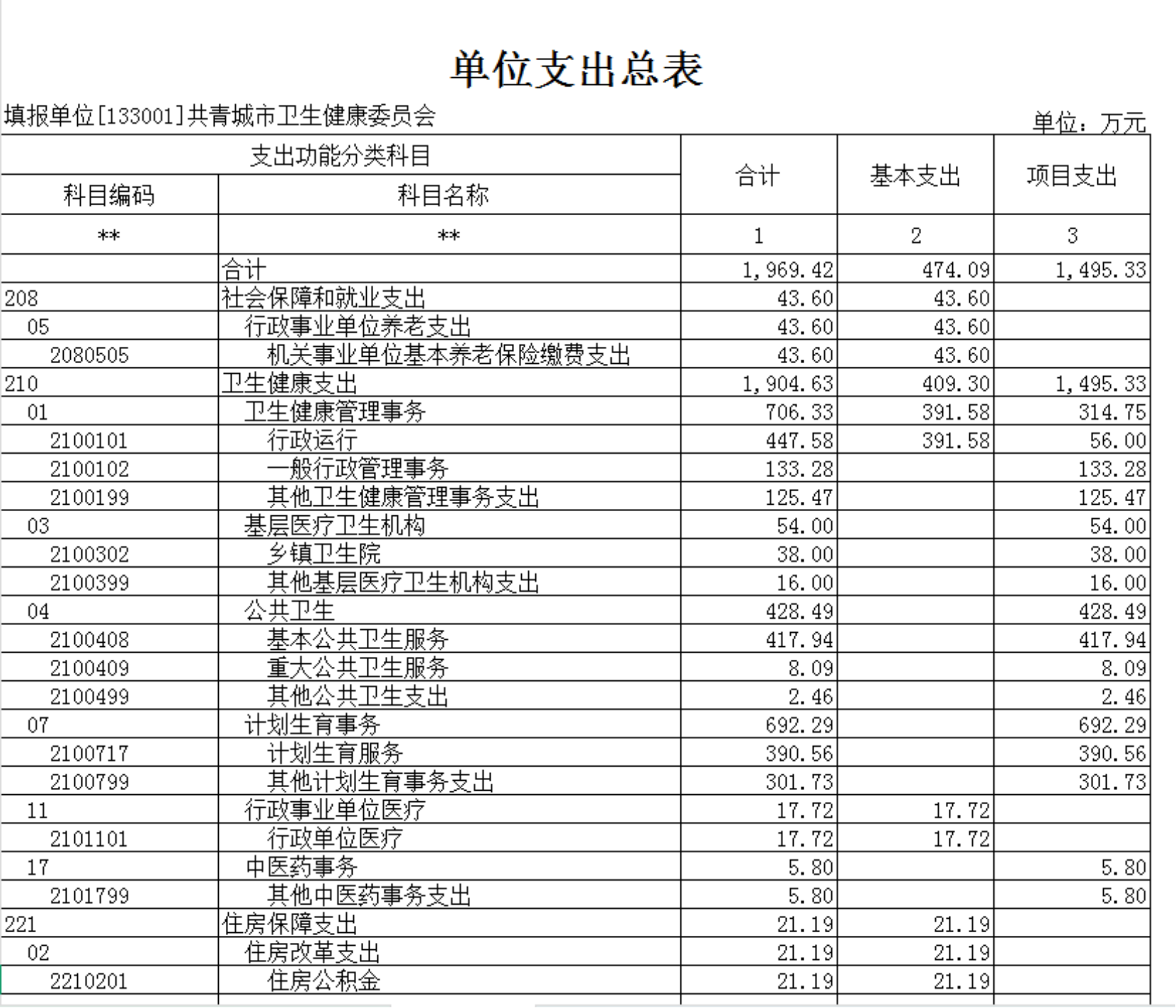 按支出功能科目划分:一般公共服务支出0万元,占支出预算总额的0%,较上年预算安排减少15万元;社会保障和就业支出43.6万元,占支出预算总额的2.21%,较上年预算安排增加3.93万元;卫生健康支出1904.63万元,占支出预算总额的96.71%,较上年预算安排减少475.32万元;住房保障支出21.19万元,占支出预算总额的1.08%,较上年预算安排增加1.3万元。