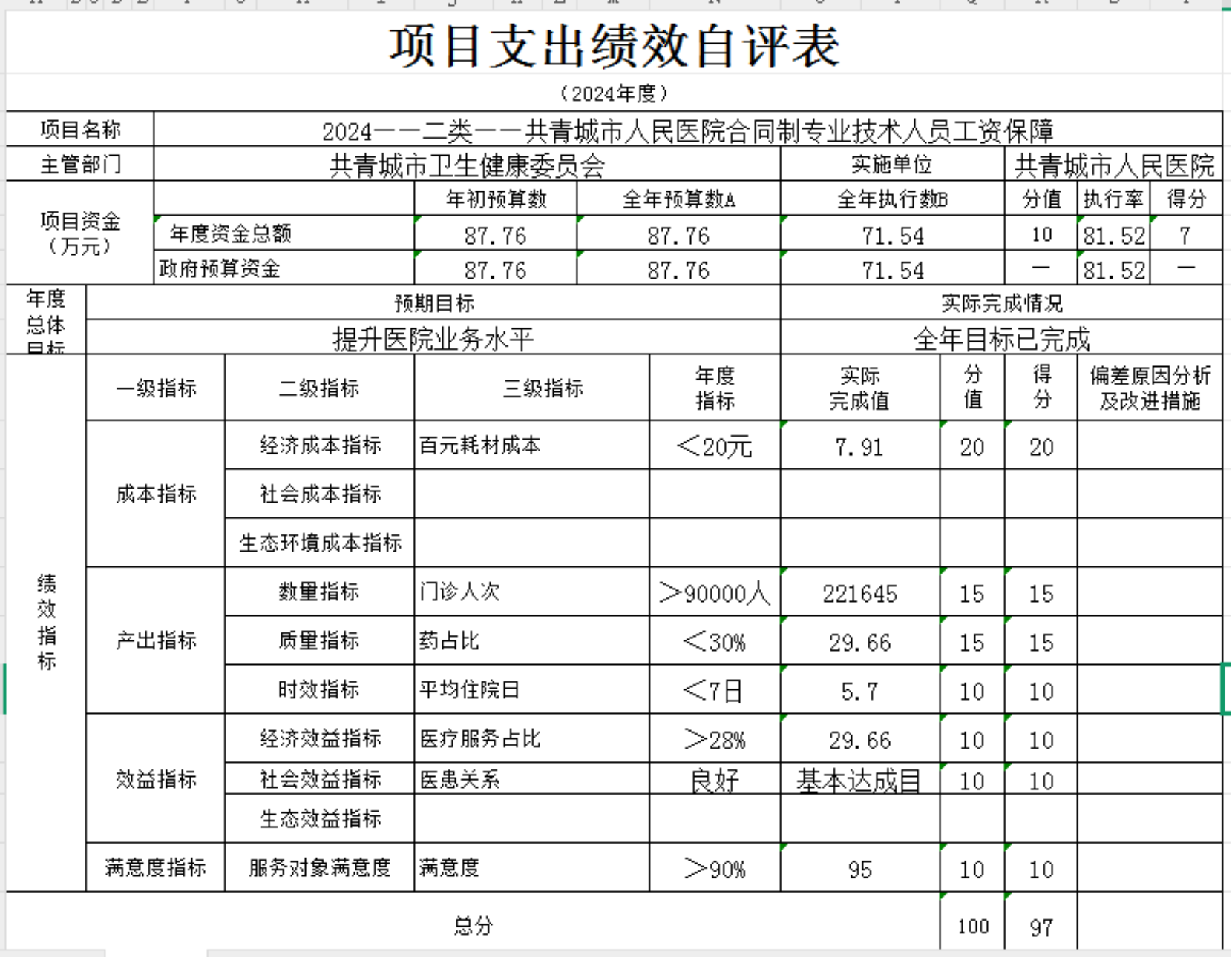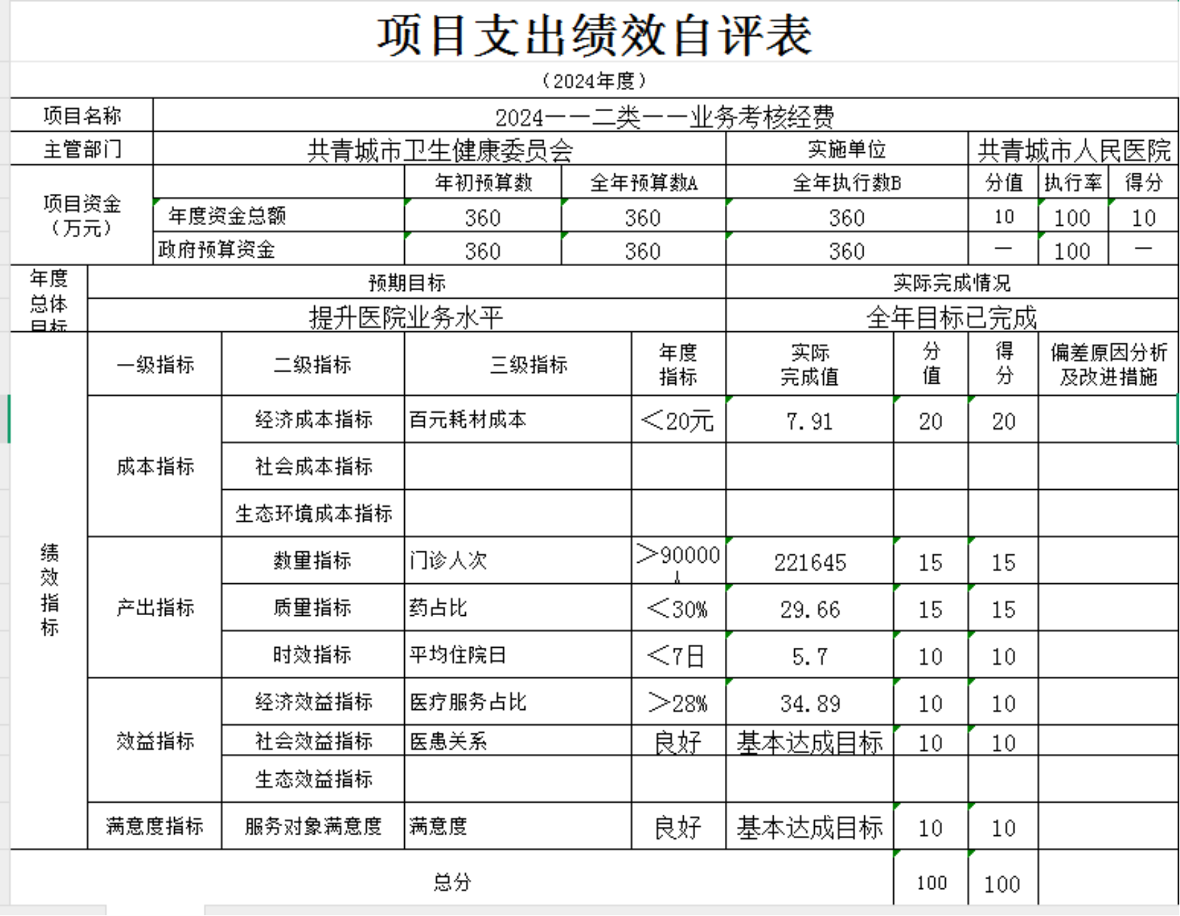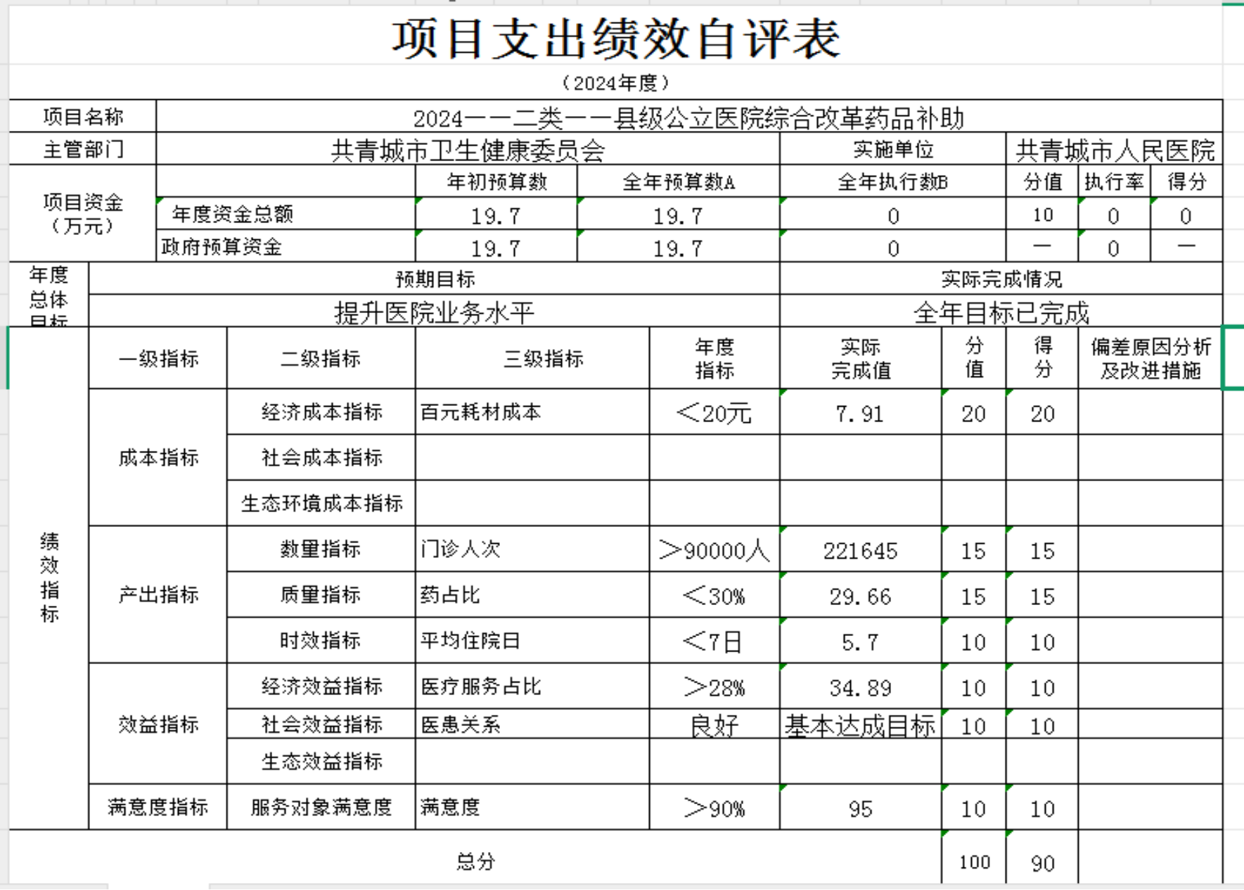 本单位“ 县级公立医院综合改革药品补助 ”“ 业务考核经费 ”“共青城市人民医院合同制专业技术人员工资保障”等项目支出绩效自评结果如下: