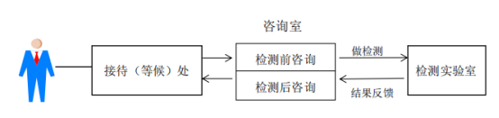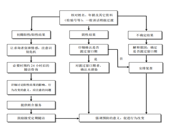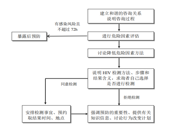 VCT 服务流程:求询者先到接待处(室)登记,由工作人员介绍服务内容与程序,并解释需要等待多长时间,稍作休息,看一些宣传材料,再进入咨询室,由咨询员为求询者提供检测前咨询。求询者在接受咨询后,自愿决定是否接受 HIV、梅毒和丙肝检测,如同意,则进行检测。检测结果出来后由工作人员电话告知,需要检测报告的于规定的日期到咨询室领取检测结果并接受咨询。