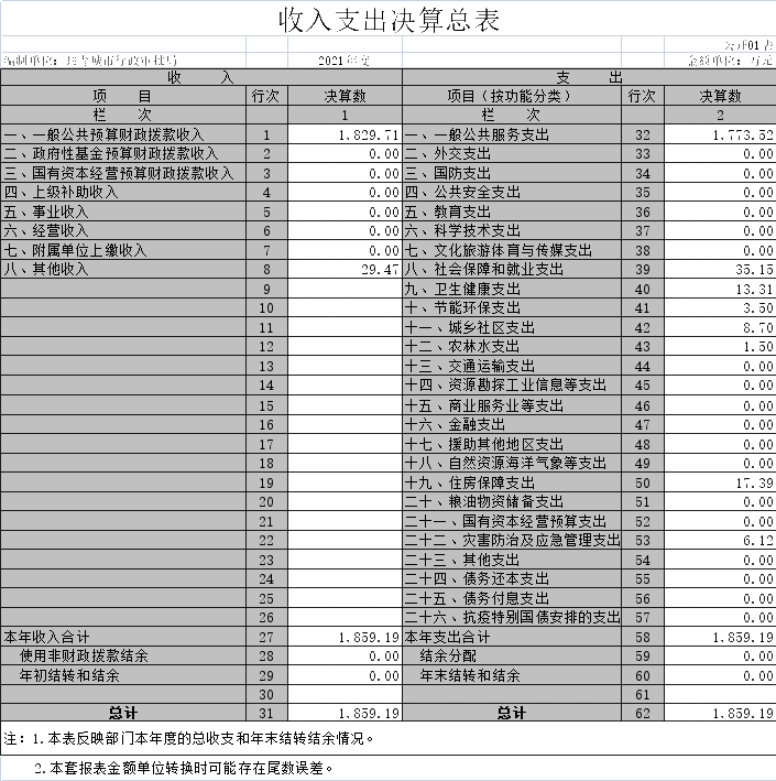 2021年预算收入总计为1477.56万元。其中:经费拨款为462.11万元,占收入总额的31.28%;专项收入1009万元,占收入总额的68.32%;国库集中支付网上结转6.45万元,占收入总额的0.4%。2021年财政拨款支出预算1471.11万元,占支出预算总额的99.56%,具体支出情况是:行政运行676.83万元,占财政拨款支出预算总额的46%、一般行政管理事务213万元,占财政拨款支出预算总额的14.48%;其他政府办公厅(室)及相关事务支出514万元,占财政拨款支出预算总额的34.94%;机关事业单位基本养老保险缴费支出28.35万元,占财政拨款支出预算总额的1.93%;行政单位医疗18.26万元,占财政拨款支出预算总额的1.24%;住房公积金20.67万元,占财政拨款支出预算总额的1.41%。