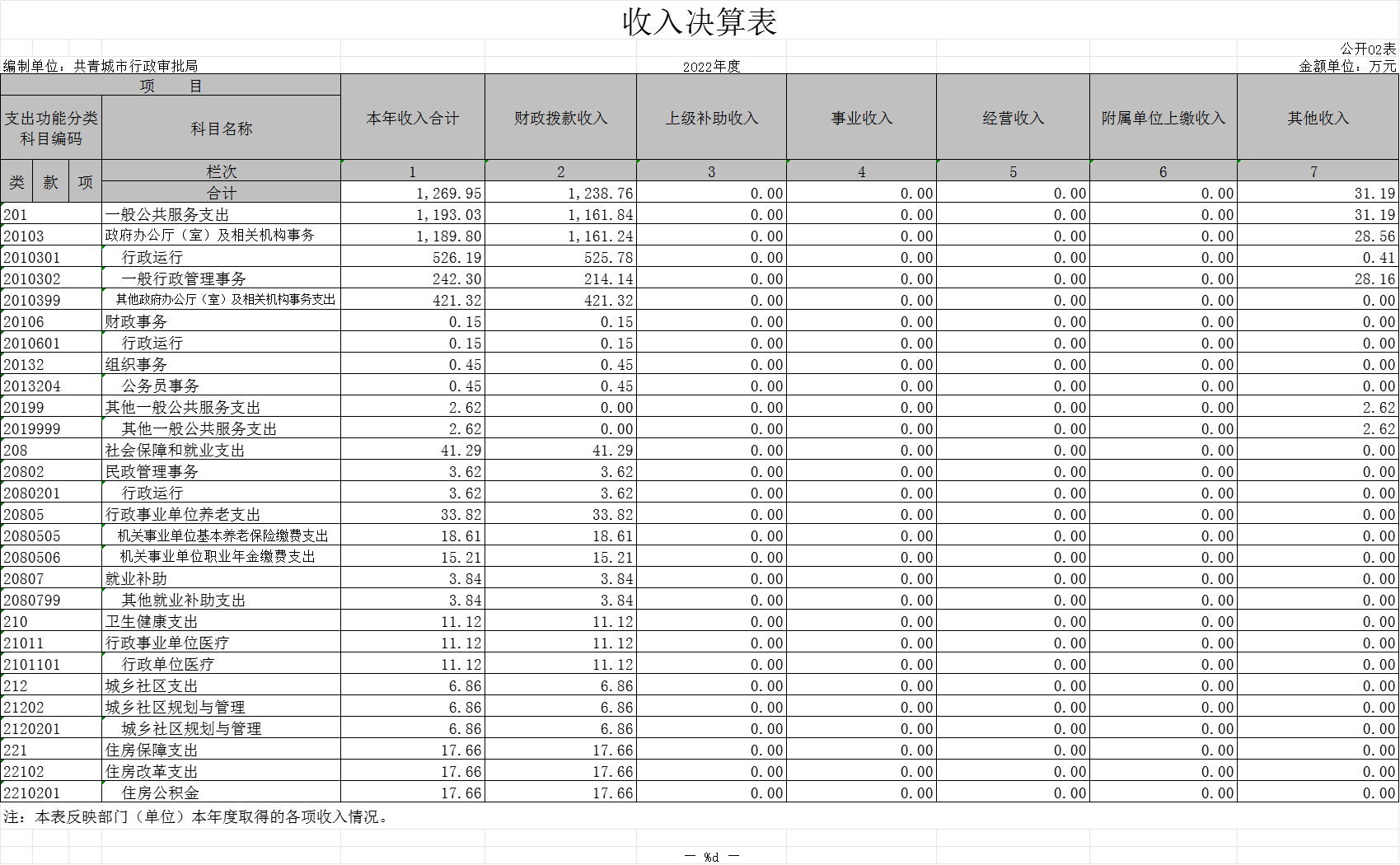 本部门2022年度收入总计1269.95万元,其中年初结转和结余0万元,较2021年减少589.24万元,下降31.69%;本年收入合计1269.95万元,较2021年减少589.24万元,下降31.69%,主要原因是:2022年减少了政务服务系统升级改造项目经费支出。