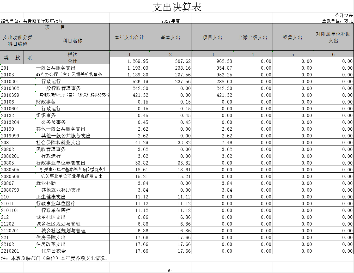 本部门2022年度支出总计1269.95万元,其中本年支出合计1269.95万元,较2021年减少589.24万元,下降31.69%,主要原因是:2022年减少了政务服务系统升级改造项目经费支出;年末结转和结余0万元,较2021年增加0万元,增长0%,主要原因是:2022年无结转和结余资金。