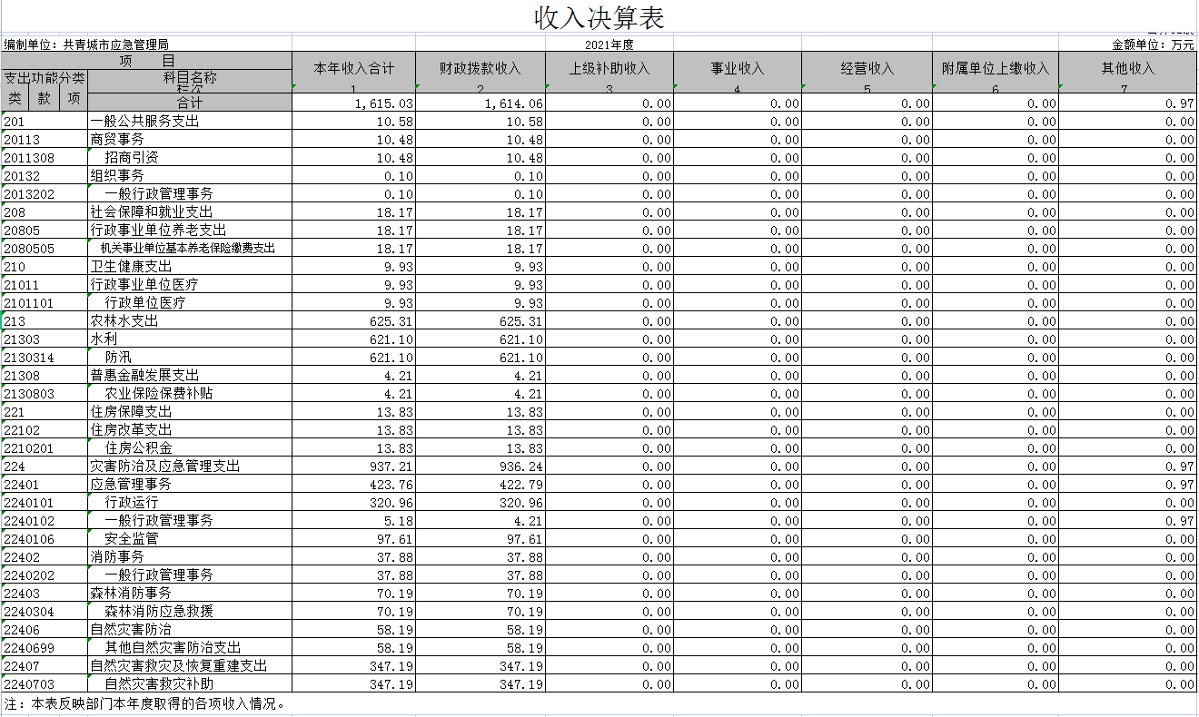 本年收入的具体构成为:财政拨款收入1614.06万元,占99.94%;事业收入0万元,占0%;经营收入0万元,占0%;其他收入0.97万元,占0.06 %。