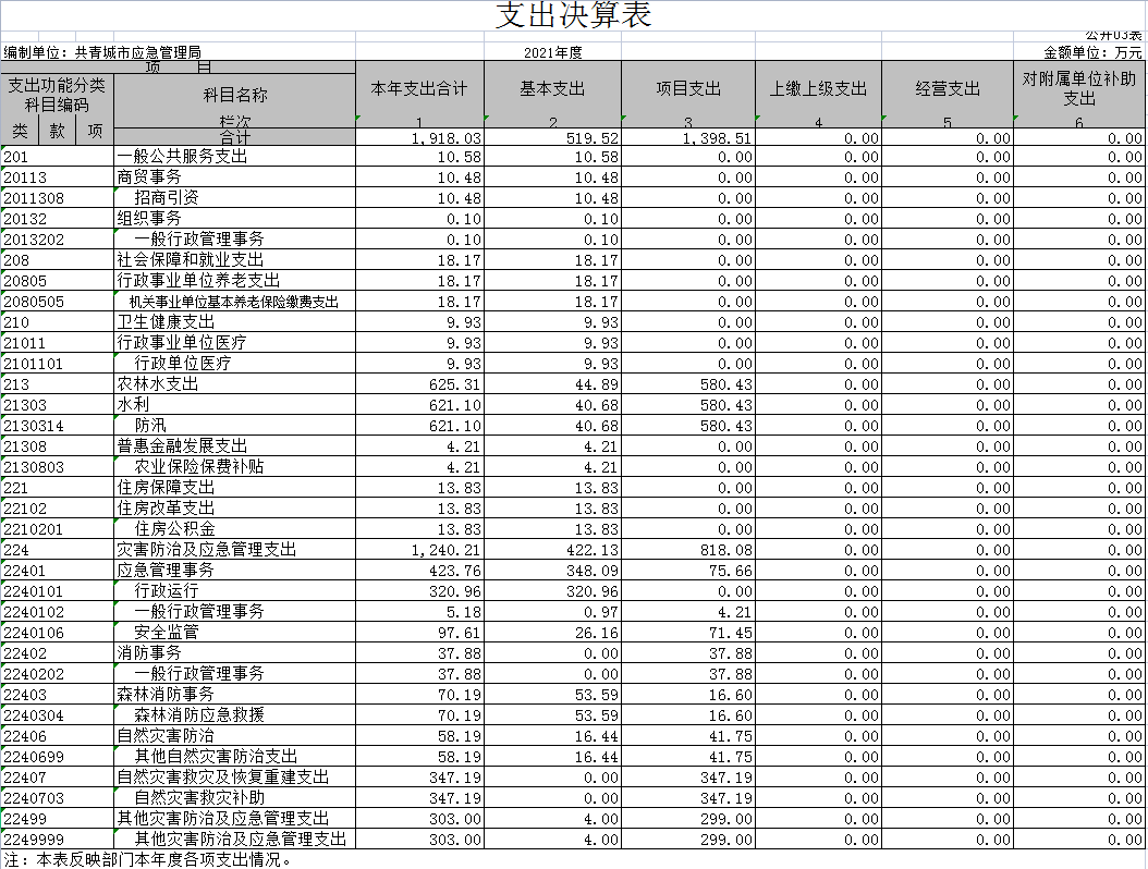 本部门2021年度支出总计1918.03万元,其中本年支出合计1918.03万元,较2020年增加1177.83万元,增长159.12%,主要原因是:拨付了2020年大汛期间抢险费用;年末结转和结余0万元,较2020年减少303万元,减少100%,主要原因是:2021年无结转资金。
