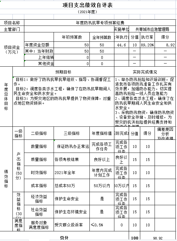 根据年初设定的绩效目标,预算项目、部门整体支出项目绩效自评得分为98分。项目全年预算数为782.66元,执行数为627.4万元,完成预算的80.16%。发现的问题及原因:没有开展预算绩效管理工作的宣传培训,绩效评价结果应用不够。原因分析:没有做到计划先行,科学地做好年度预算绩效。下一步改进措施:一是强化绩效理念,深入推进评价工作,进一步加强各科室绩效管理理念,将“要我评价”的被动认识转化为“我要评价”的主动实践,健全完善评价机制,切实加强组织领导,深入推进评价工作,提升整体绩效管理水平。二是强化事前准备,提升评价质量。在推进自身评价工作开展时,结合评价工作实际,项目实施过程中规范化、严格化,确保绩效评价结果公正、客观、精准、真实反映绩效,如实反映问题,切实提高评价质量。三是总结经验,完善绩效评价。总结2021年的工作经验,进一步推进预算绩效管理工作,提高财政资金使用效益,以确保项目资金按项目进度支付。
