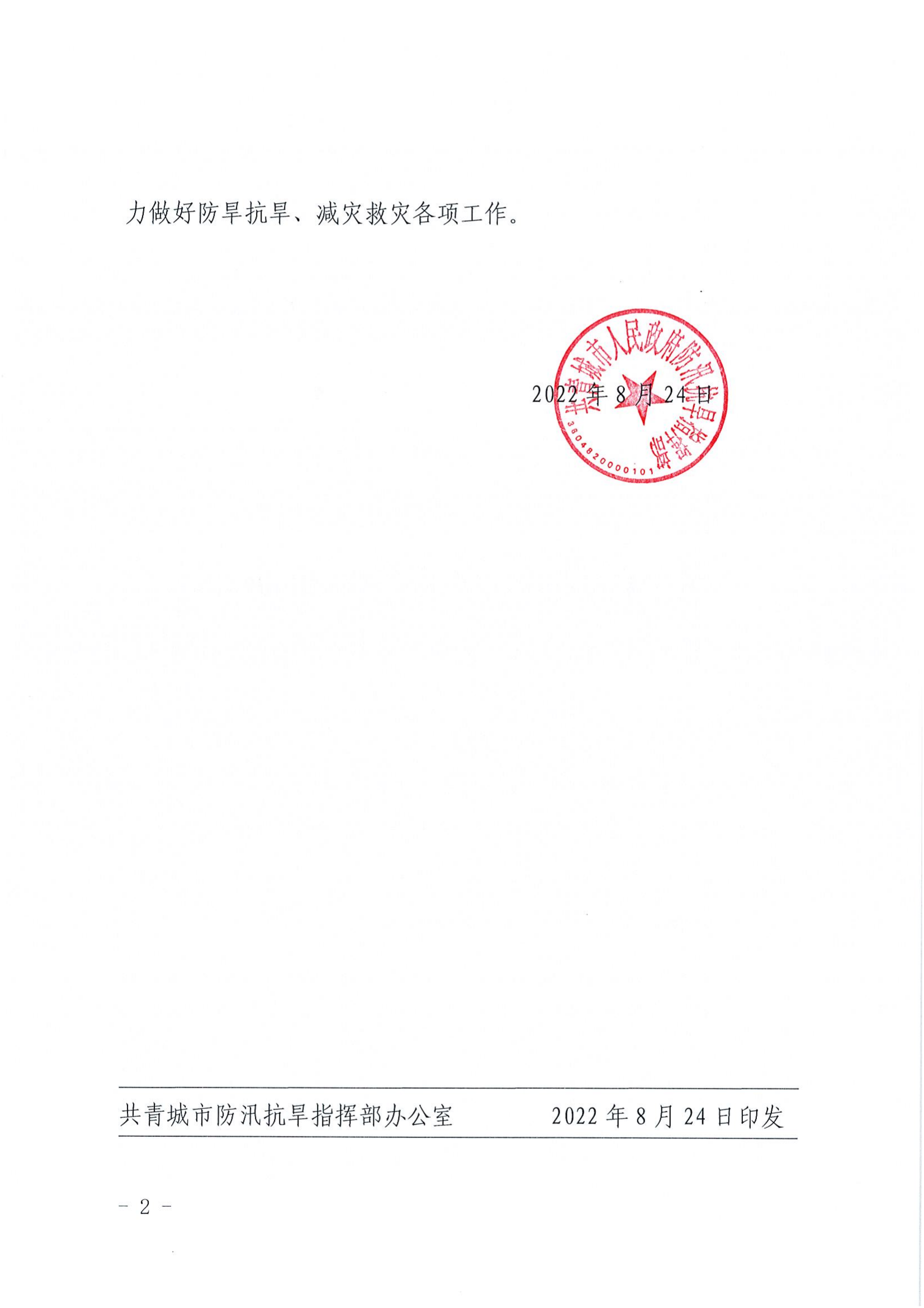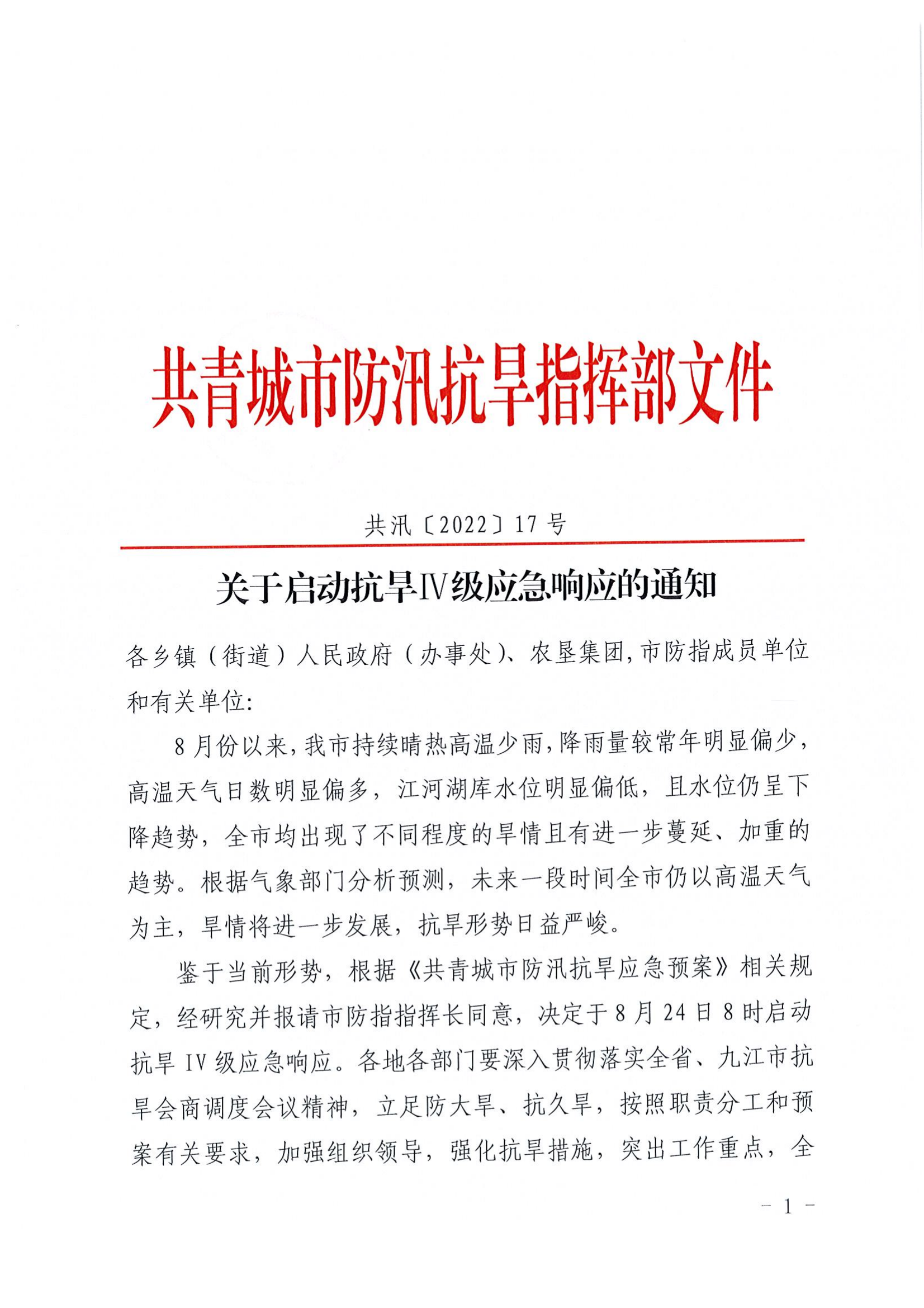 共汛〔2022〕17号关于启动抗旱Ⅳ级应急响应的通知