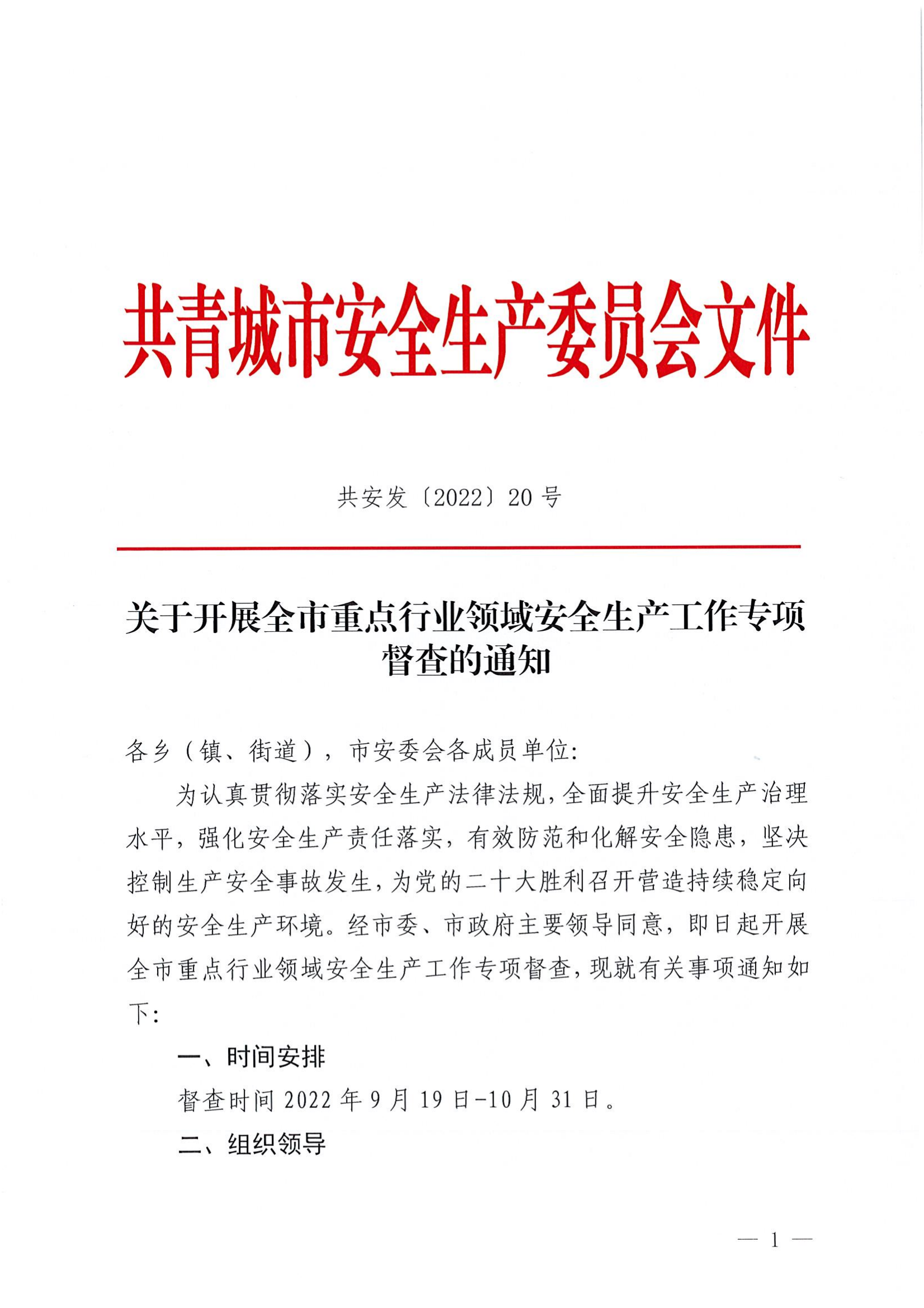 共安发〔2022〕20号_关于开展全市重点行业领域安全生产工作专项督查的通知