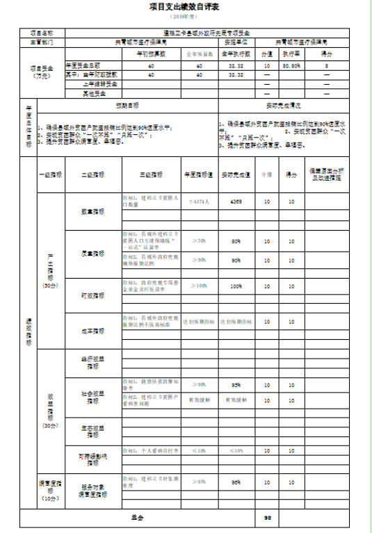 建档立卡县域外政府兜底项目绩效自评综述:根据年初设定的绩效目标,建档立卡县域外政府兜底项目绩效自评得分为98分。项目全年预算数为40万元,执行数为32.32万元,完成预算的80.8%。主要产出和效果:一是县域外政府兜底确保报销比例达到90%适度水平;二是建档立卡贫困户看病贵问题得到有效缓解。发现的问题及原因:暂未发现问题。下一步改进措施:进一步加强绩效管理工作,进行全方位的绩效管理。