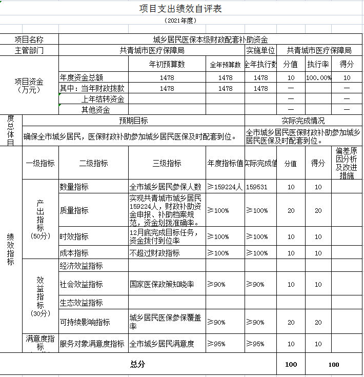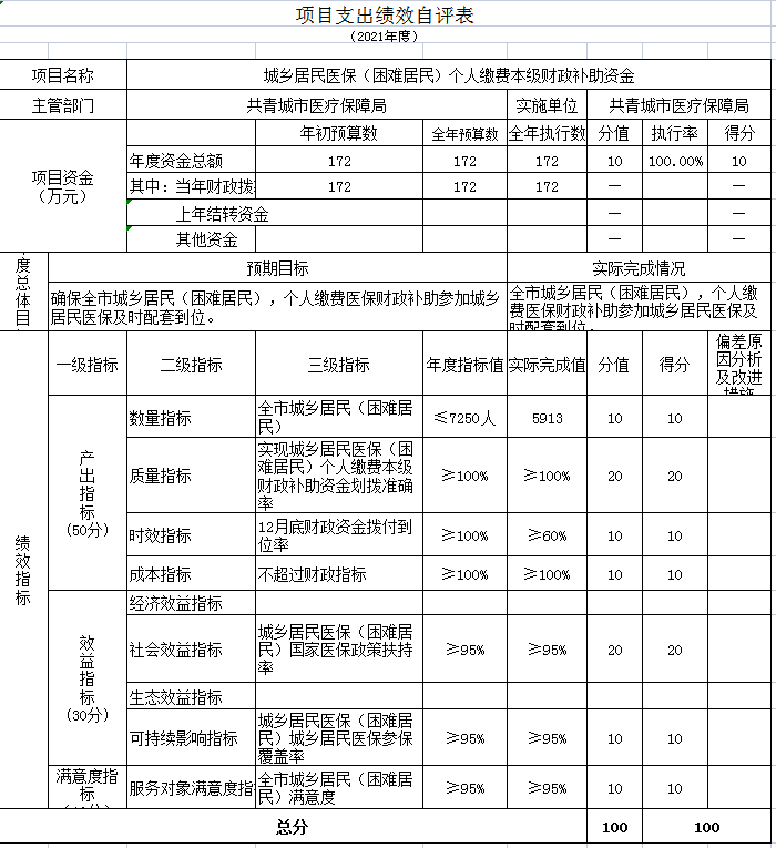 通过对“2021年共青城市医疗保障局部门整体支出”绩效自评,认为我局在2021年认真落实市委、市政府和省、市医保局的决策部署,坚持“服务民生”的工作主线,以“不忘初心、牢记使命”主题教育为抓手,实现“一次不跑”“只跑一次”精简办事流程,以“打击欺诈骗保,维护基金安全”为重点,不断优化异地就医即时结算流程,加大参保缴费扩面工作,全面提升医保服务水平,圆满地完成了全年工作目标任务。经过各项指标的认真评价和综合评审,综合得分为100分。