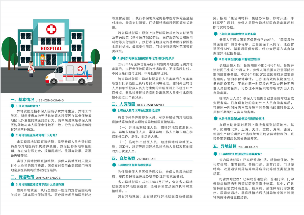 省内异地就医:从2023年4月开始,全省省内异地就医无需异地就医备案,全省异地定点医疗机构可直接结算。。